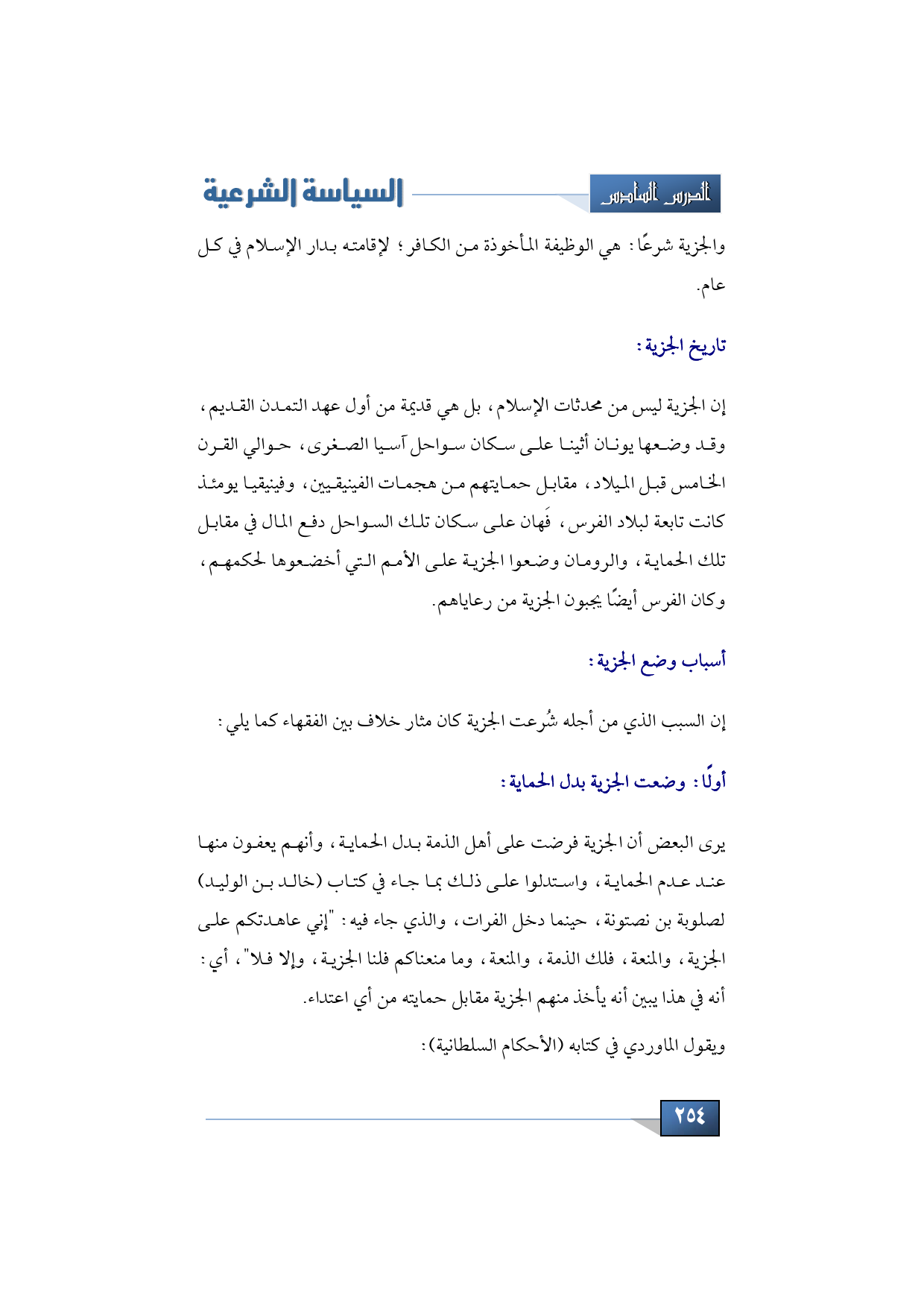 ويقول الماوردي في كتابه (الأحكام السلطانية):