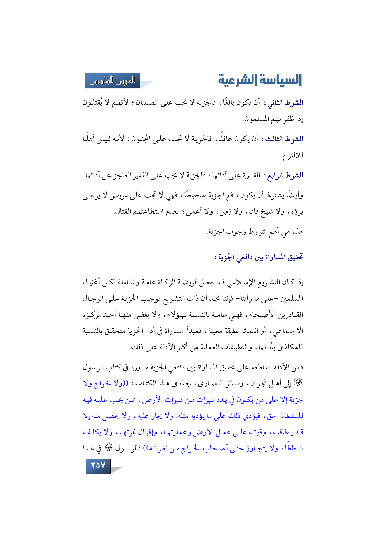 وإذا كان التشريع الإسلامي قد جعل فريضة الزكاة عامة, وشاملة لكل أغنياء المسلمين -على ما رأينا- فإننا نجد أن ذات التشريع يوجب الجزية على الرجال القادرين الأصحاء, فهي عامة بالنسبة لهؤلاء, ولا يعفى منها أحد لمركزه الاجتماعي, أو انتمائه لطبقة معينة, فمبدأ المساواة في أداء الجزية متحقق بالنسبة للمكلفين بأدائها, والتطبيقات العملية من أكبر الأدلة على ذلك, فمن الأدلة القاطعة على تحقيق المساواة بين دافعي الجزية ما ورد في كتاب الرسول -صلى الله عليه وسلم- إلى أهل نجران, وسائر النصارى, جاء في هذا الكتاب: ((ولا خراج ولا جزية إلا على من يكون في يده ميراث من ميراث الأرض, ممن يجب عليه فيه للسلطان حق, فيؤدي ذلك على ما يؤديه مثله. ولا يجار عليه, ولا يحصل منه إلا قدر طاقته, وقوته على عمل الأرض وعمارتها, وإقبال ثمرتها, ولا يكلف شططًا, ولا يتجاوز حتى أصحاب الخراج من نظرائه)) فالرسول -صلى الله عليه وسلم- في هذا