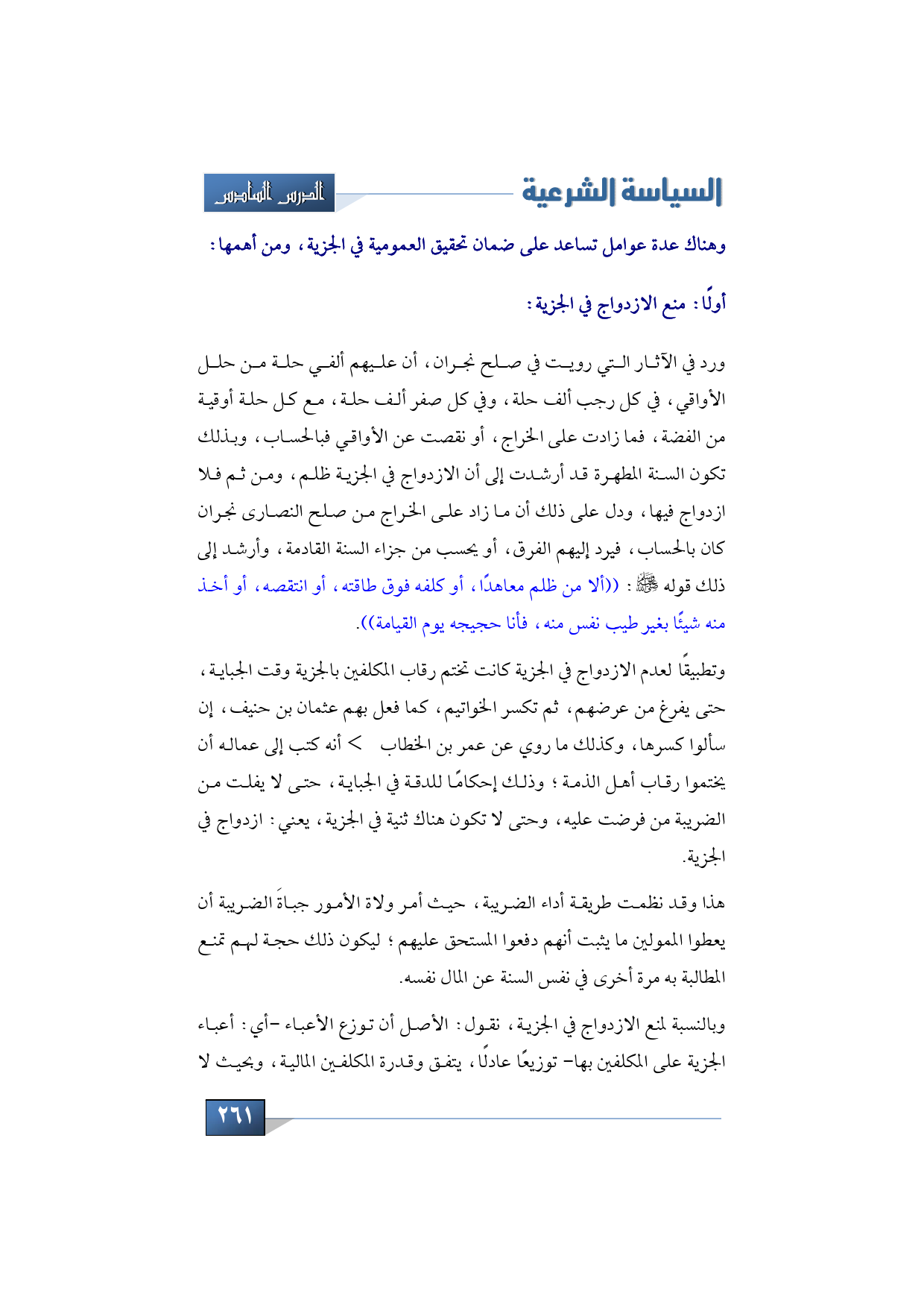 ورد في الآثار التي رويت في صلح نجران, أن عليهم ألفي حلة من حلل الأواقي, في كل رجب ألف حلة, وفي كل صفر ألف حلة, مع كل حلة أوقية من الفضة, فما زادت على الخراج, أو نقصت عن الأواقي فبالحساب, وبذلك تكون السنة المطهرة قد أرشدت إلى أن الازدواج في الجزية ظلم, ومن ثم فلا ازدواج فيها, ودل على ذلك أن ما زاد على الخراج من صلح النصارى نجران كان بالحساب, فيرد إليهم الفرق, أو يحسب من جزاء السنة القادمة, وأرشد إلى ذلك قوله -صلى الله عليه وسلم: ((ألا من ظلم معاهدًا, أو كلفه فوق طاقته, أو انتقصه, أو أخذ منه شيئًا بغير طيب نفس منه, فأنا حجيجه يوم القيامة)).