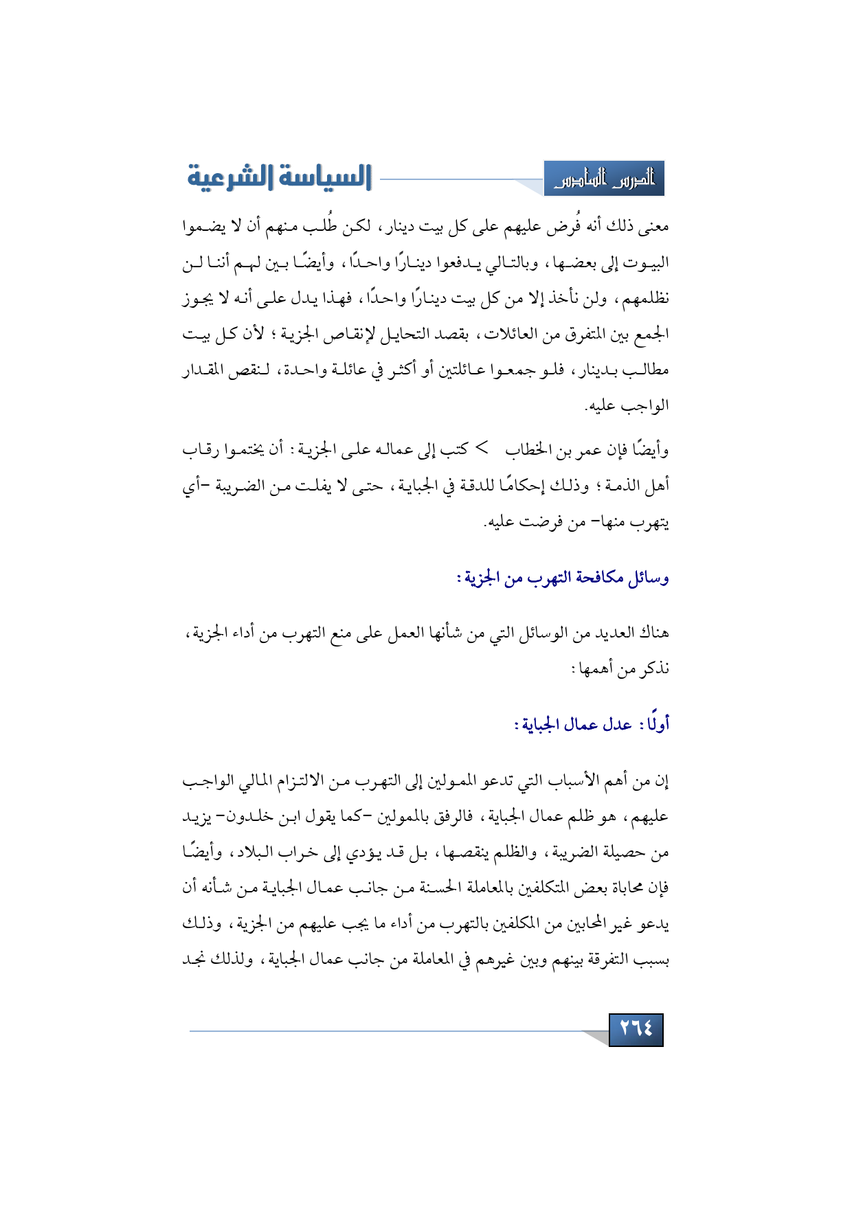 وأيضًا فإن عمر بن الخطاب كتب إلى عماله على الجزية أن يختموا رقاب أهل الذمة؛ وذلك إحكامًا للدقة في الجباية, حتى لا يفلت من الضريبة -أي يتهرب منها- من فرضت عليه.