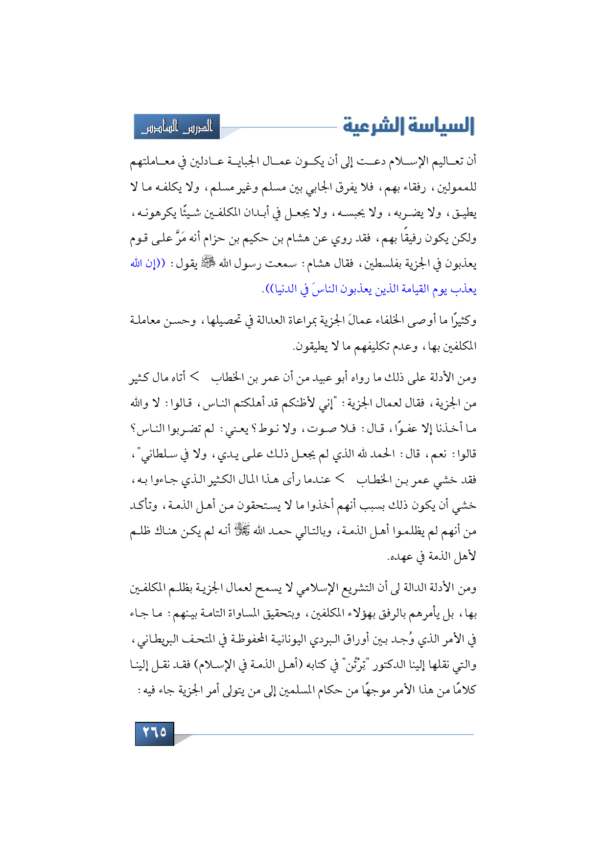 ومن الأدلة الدالة لى أن التشريع الإسلامي لا يسمح لعمال الجزية بظلم المكلفين بها, بل يأمرهم بالرفق بهؤلاء المكلفين, وبتحقيق المساواة التامة بينهم, ما جاء في الأمر الذي وُجد بين أوراق البردي اليونانية المحفوظة في المتحف البريطاني, والتي نقلها إلينا الدكتور "تِرْتُن" في كتابه (أهل الذمة في الإسلام) فقد نقل إلينا كلامًا من هذا الأمر موجهًا من حكام المسلمين إلى من يتولى أمر الجزية جاء فيه: