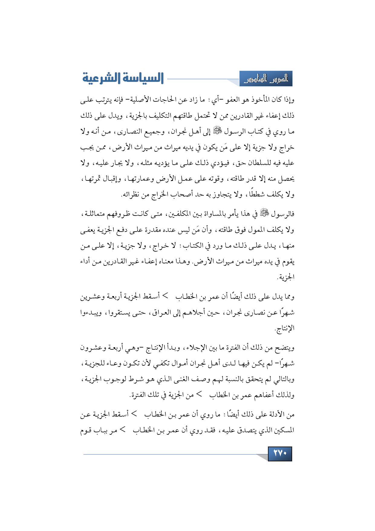 وإذا كان المأخوذ هو العفو, أي ما زاد عن الحاجات الأصلية, فإنه يترتب على ذلك إعفاء غير القادرين ممن لا تحتمل طاقتهم التكليف بالجزية, ويدل على ذلك ما روي في كتاب الرسول -صلى الله عليه وسلم- إلى أهل نجران, وجميع النصارى, من أنه ولا خراج ولا جزية إلا على من يكون في يديه ميراث من ميراث الأرض, ممن يجب عليه فيه للسلطان حق, فيؤدي ذلك على ما يؤديه مثله, ولا يجار عليه, ولا يحصل منه إلا قدر طاقته, وقوته على عمل الأرض وعمارتها, وإقبال ثمرتها, ولا يكلف شططًا, ولا يتجاوز به حد أصحاب الخراج من نظرائه.