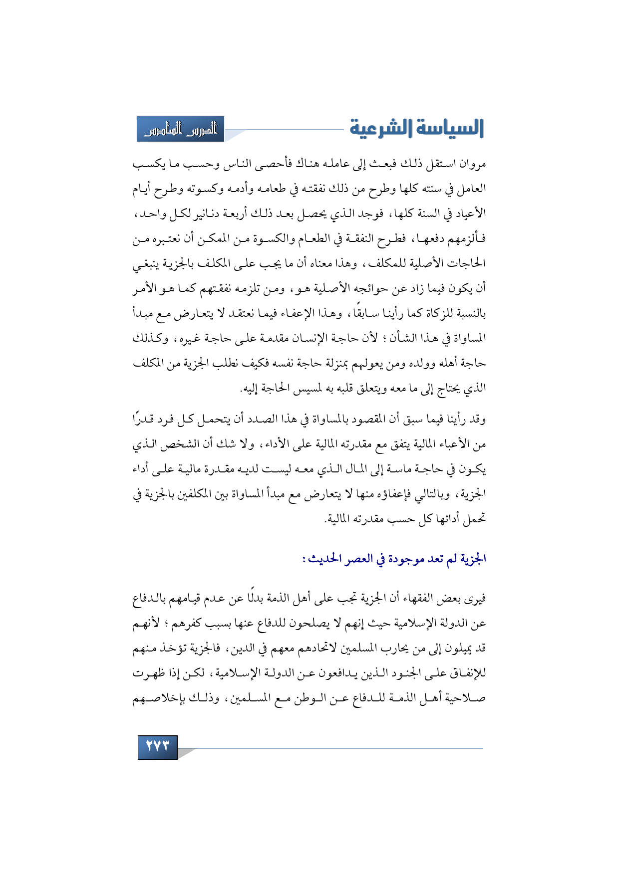 استقل ذلك فبعث إلى عامله هناك فأحصى الناس وحسب ما يكسب العامل في سنته كلها وطرح من ذلك نفقته في طعامه وأدمه وكسوته وطرح أيام الأعياد في السنة كلها فوجد الذي يحصل بعد ذلك أربعة دنانير لكل واحد، فألزمهم دفعها، فطرح النفقة في الطعام والكسوة من الممكن أن نعتبره من الحاجات الأصلية للمكلف، وهذا معناه أن ما يجب على المكلف بالجزية ينبغي أن يكون فيما زاد عن حوائجه الأصلية هو، ومن تلزمه نفقتهم كما هو الأمر بالنسبة للزكاة كما رأينا سابقًا، وهذا الإعفاء فيما نعتقد لا يتعارض مع مبدأ المساواة في هذا الشأن؛ لأن حاجة الإنسان مقدمة على حاجة غيره، وكذلك حاجة أهله وولده ومن يعولهم بمنزلة حاجة نفسه فكيف نطلب الجزية من المكلف الذي يحتاج إلى ما معه ويتعلق قلبه به لمسيس الحاجة إليه، وقد رأينا فيما سبق أن المقصود بالمساواة في هذا الصدد أن يتحمل كل فرد قدرًا من الأعباء المالية يتفق مع مقدرته المالية على الأداء، ولا شك أن الشخص الذي يكون في حاجة ماسة إلى المال الذي معه ليست لديه مقدرة مالية على أداء الجزية، وبالتالي فإعفاؤه منها لا يتعارض مع مبدأ المساواة بين المكلفين بالجزية في تحمل أدائها كل حسب مقدرته المالية، لكن مما تجب ملاحظته هنا أن الجزية لم تعد موجودة في العصر الحديث، يرى بعض الفقهاء أن الجزية تجب على أهل الذمة بدلًا عن عدم قيامهم بالدفاع عن الدولة الإسلامية حيث إنهم لا يصلحون للدفاع عنها بسبب كفرهم؛ لأنهم قد يميلون إلى من يحارب المسلمين لاتحادهم معهم في الدين، فالجزية تؤخذ منهم للإنفاق على الجنود الذين يدافعون عن الدولة الإسلامية، لكن إذا ظهرت صلاحية أهل الذمة للدفاع عن الوطن مع المسلمين، وذلك بإخلاصهم