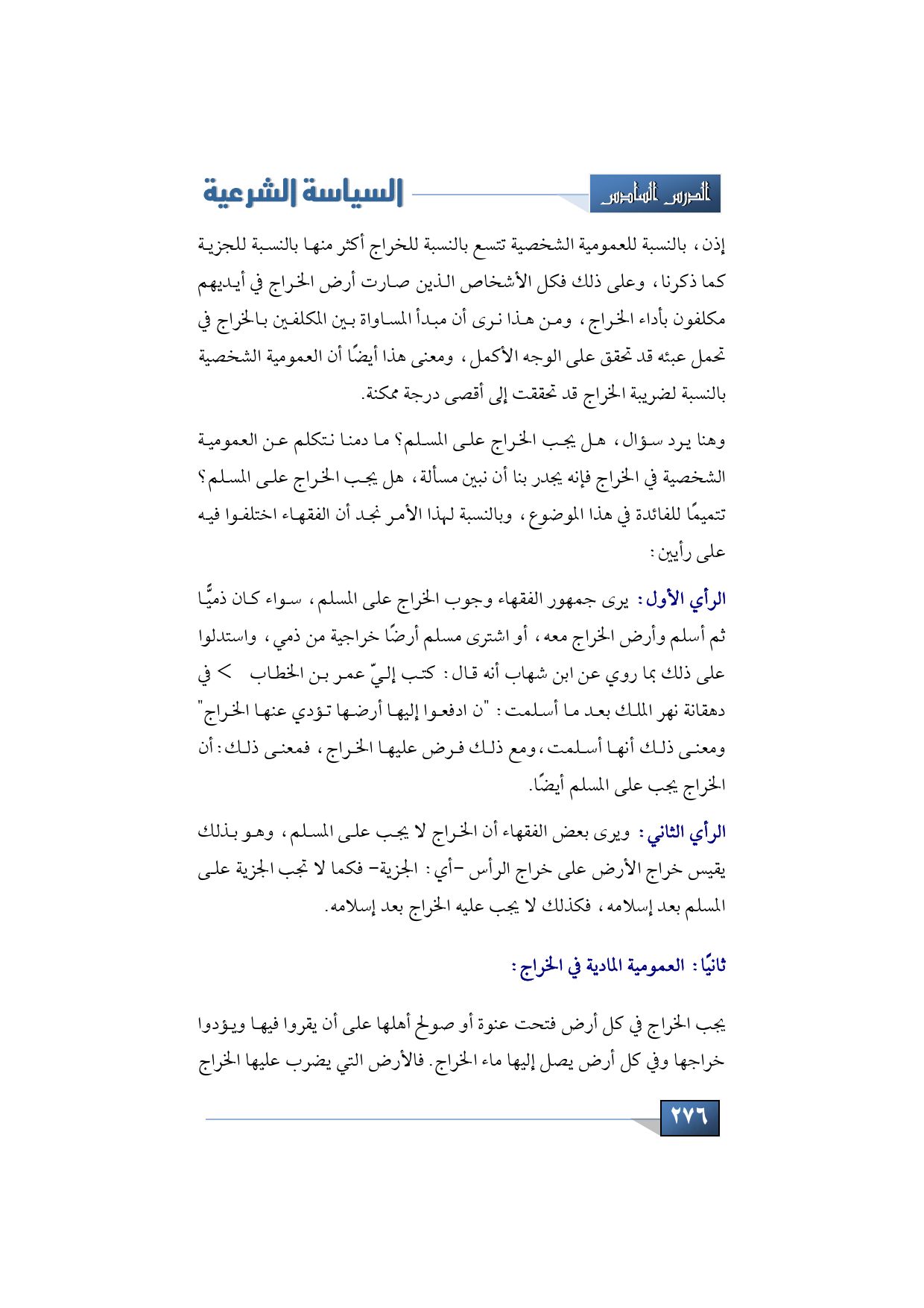 ويرى بعض الفقهاء أن الخراج لا يجب على المسلم، وهو بذلك يقيس خراج الأرض على خراج الرأس أي: الجزية فكما لا تجب الجزية على المسلم بعد إسلامه فكذلك لا يجب عليه الخراج بعد إسلامه، وبالنسبة للعمومية المادية في الخراج نقول: يجب الخراج في كل أرض فتحت عنوة أو صولح أهلها على أن يقروا فيها ويؤدوا خراجها وفي كل أرض يصل إليها ماء الخراج، ينظر ذلك في (الأموال) لأبي عبيد: صـ92 وما بعدها، فالأرض التي يضرب عليها الخراج
