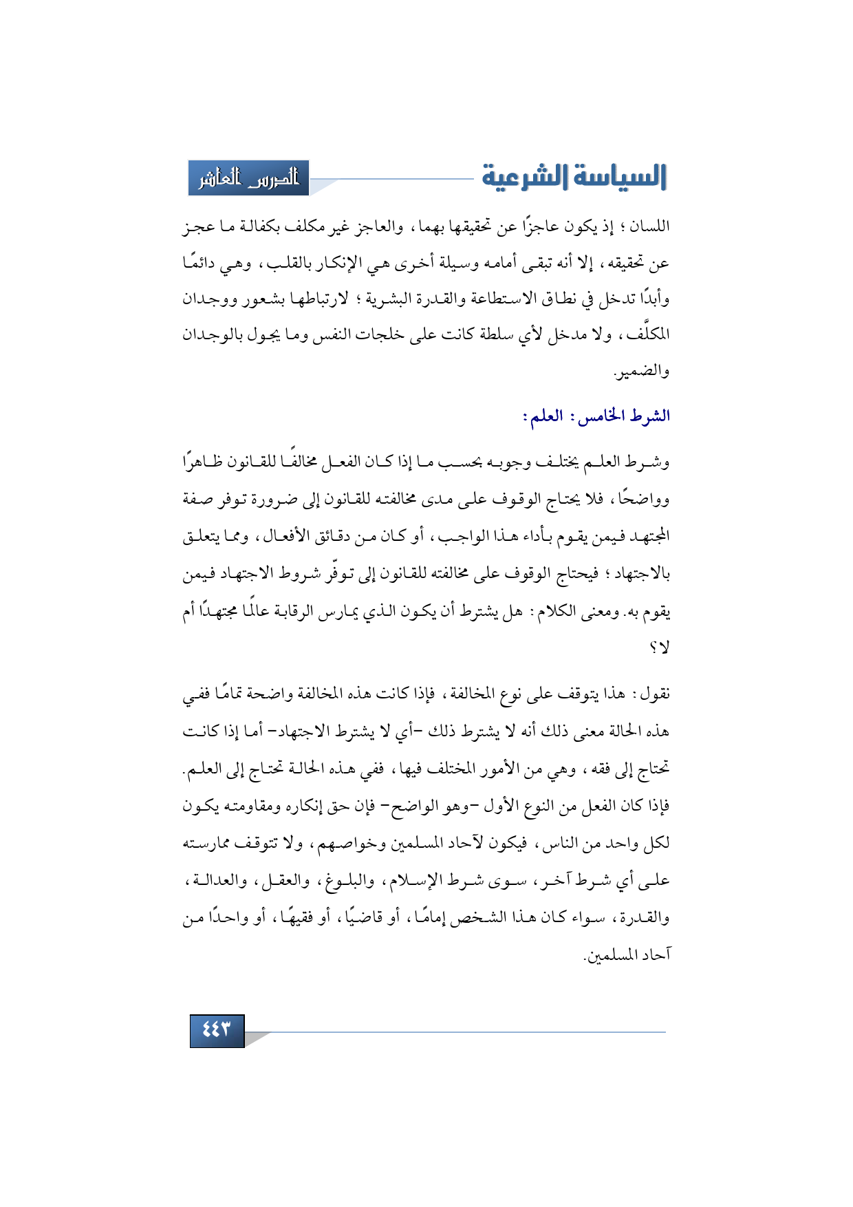 وشرط العلم يختلف وجوبه بحسب ما إذا كان الفعل مخالف للقانون ظاهرًا وواضحًا، فلا يحتاج الوقوف على مدى مخالفته للقانون إلى ضرورة توفر صفة المجتهد فيمن يقوم بأداء هذا الواجب، أو كان من دقائق الأفعال، ومما يتعلق بالاجتهاد؛ فيحتاج الوقوف على مخالفته للقانون إلى توفّر شروط الاجتهاد فيمن يقوم به. أي معنى الكلام: هل يشترط أن يكون الذي يمارس الرقابة عالمًا مجتهدًا أم لا؟