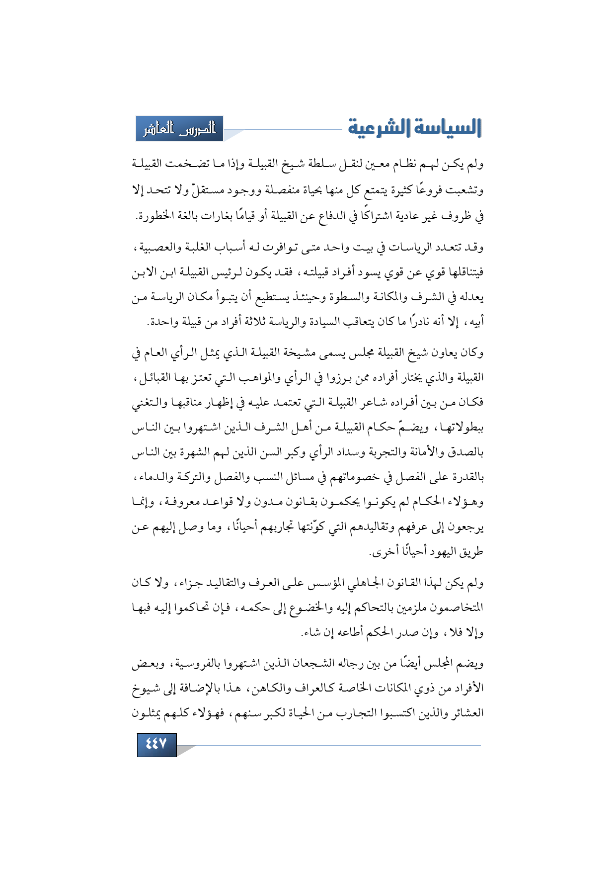 ولم يكن لهم نظام معين لنقل سلطة شيخ القبيلة وإذا ما تضخمت القبيلة وتشعبت فروعًا كثيرة يتمتع كل منها بحياة منفصلة ووجود مستقلّ ولا تتحد إلا في ظروف غير عادية اشتراكًا في الدفاع عن القبيلة أو قيامًا بغارات بالغة الخطورة، وقد تتعدد الرياسات في بيت واحد متى توافرت له أسباب الغلبة والعصبية، فيتناقلها قوي عن قوي يسود أفراد قبيلته، فقد يكون لرئيس القبيلة ابن الابن يعدله في الشرف والمكانة والسطوة وحينئذ يستطيع أن يتبوأ مكان الرياسة من أبيه، إلا أنه نادرًا ما كان يتعاقب السيادة والرياسة ثلاثة أفراد من قبيلة واحدة.