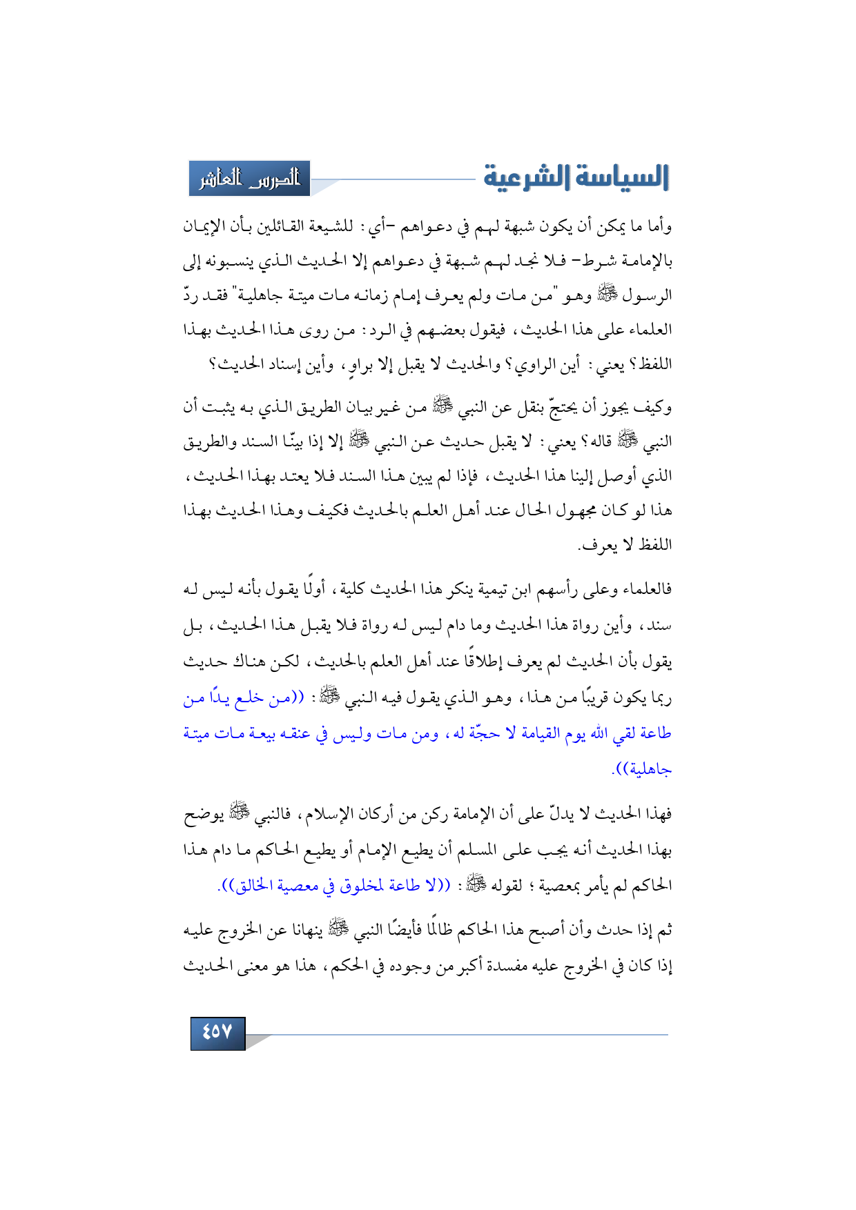 وأما يمكن أن يكون شبهة لهم في دعواهم أي: للشيعة القائلين بأن الإيمان بالإمامة شرط، لا نجد لهم شبهة في دعواهم إلا الحديث الذي ينسبونه إلى الرسول -صلى الله عليه وسلم- وهو من مات ولم يعرف إمام زمانه مات ميتة جاهلية فقد ردّ العلماء على هذا الحديث، فيقول بعضهم في الرد: من روى هذا الحديث بهذا اللفظ؟ يعني: أين الراوي؟ والحديث لا يقبل إلا براوٍ، وأين إسناد الحديث؟ وكيف يجوز أن يحتجّ بنقل عن النبي -صلى الله عليه وسلم- من غير بيان الطريق الذي به يثبت أن النبي -صلى الله عليه وسلم- قاله؟ يعني: لا يقبل حديث عن النبي -صلى الله عليه وسلم- إلا إذا بينّا السند، بينا الطريق الذي أوصل إلينا هذا الحديث، فإذا لم يبين هذا السند فلا يعتد بهذا الحديث، هذا لو كان مجهول الحال عند أهل العلم بالحديث فكيف وهذا الحديث بهذا اللفظ لا يعرف؟ لأن العلماء وعلى رأسهم ابن تيمية ينكر هذا الحديث كلية، أولًا يقول بأنه ليس له سند، وأين رواة هذا الحديث وما دام ليس له رواة فلا يقبل هذا الحديث، بل يقول بأن الحديث لم يعرف إطلاقًا عند أهل العلم بالحديث، لكن هناك ربما يكون قريب من هذا، وهو الذي يقول فيه النبي -صلى الله عليه وسلم-: ((من خلع يدًا من طاعة لقي الله يوم القيامة لا حجّة له، ومن مات وليس في عنقه بيعة مات ميتة جاهلية)) فهذا الحديث لا يدلّ على أن الإمامة ركن من أركان الإسلام، فالنبي -صلى الله عليه وسلم- يوضح بهذا الحديث أنه يجب على المسلم أن يطيع الإمام أو يطيع الحاكم ما دام هذا الحاكم لم يأمر بمعصية؛ لقوله -صلى الله عليه وسلم-: ((لا طاعة لمخلوق في معصية الخالق)) ثم إذا حدث وأن أصبح هذا الحاكم ظالمًا فأيضًا النبي -صلى الله عليه وسلم- ينهانا عن الخروج عليه إذا كان في الخروج عليه مفسدة أكبر من وجوده في الحكم، هذا هو معنى الحديث