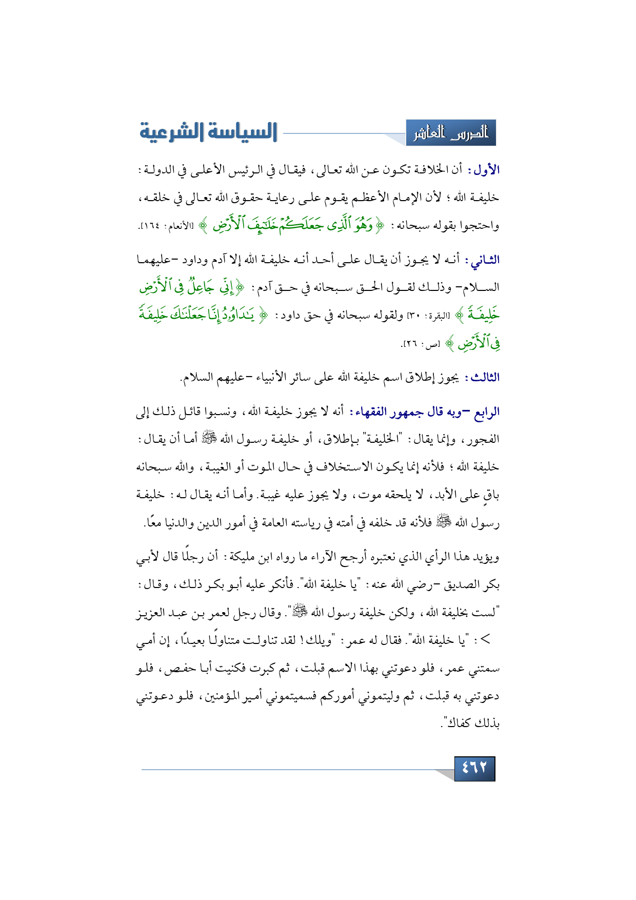 الرابع -وبه قال جمهور الفقهاء -: أنه لا يجوز خليفة الله، ونسبوا قائل ذلك إلى الفجور، وإنما يقال: "الخليفة" بإطلاق، أو خليفة رسول الله -صلى الله عليه وسلم- أما أن يقال: خليفة الله؛ فلأنه إنما يكون الاستخلاف في حال الموت أو الغيبة، والله سبحانه باقٍ على الأبد، لا يلحقه موت، ولا يجوز عليه غيبة. وأما أنه يقال له: خليفة رسول الله -صلى الله عليه وسلم- فلأنه قد خلفه في أمته في رياسته العامة في أمور الدين والدنيا معًا.