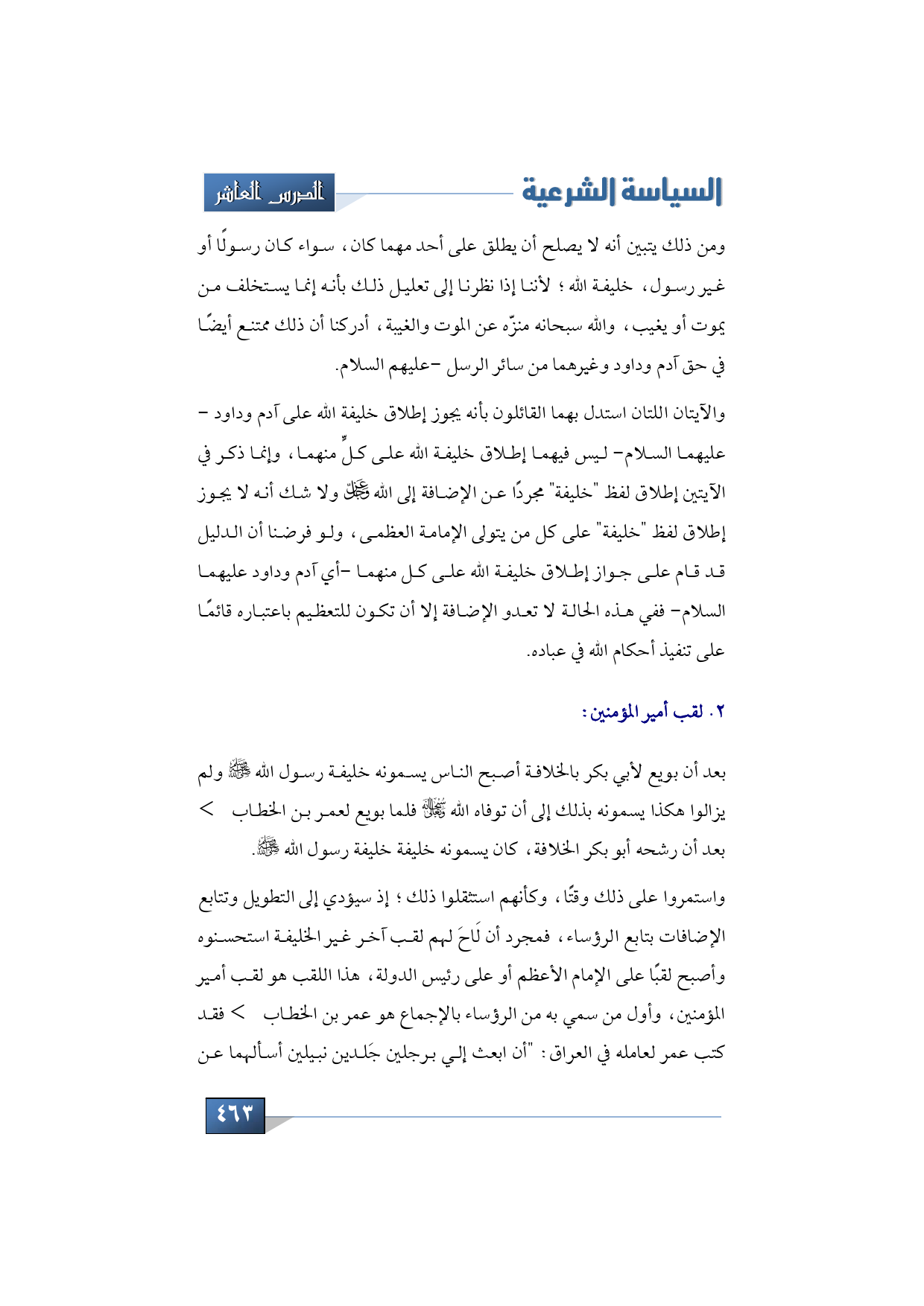 بعد أن بويع لأبي بكر بالخلافة أصبح الناس يسمونه خليفة رسول الله -صلى الله عليه وسلم- ولم يزالوا هكذا يسمونه بذلك إلى أن توفاه الله -تبارك وتعالى- فلما بويع لعمر بن الخطاب -رضي الله عنه- بعد أن رشحه أبو بكر الخلافة، كان يسمونه خليفة خليفة رسول الله -صلى الله عليه وسلم- واستمروا على ذلك وقتًا، وكأنهم استثقلوا ذلك؛ إذ سيؤدي إلى التطويل وتتابع الإضافات بتابع الرؤساء، فمجرد أن لَاحَ لهم لقب آخر غير الخليفة استحسنوه وأصبح لقبًا على الإمام الأعظم أو على رئيس الدولة، هذا اللقب هو لقب أمير المؤمنين، وأول ومن سمي به من الرؤساء بالإجماع هو عمر بن الخطاب -رضي الله عنه- فقد كتب عمر لعامله في العرق: "أن ابعث إلي برجلين جَلَدين نبيلين أسألهما عن
