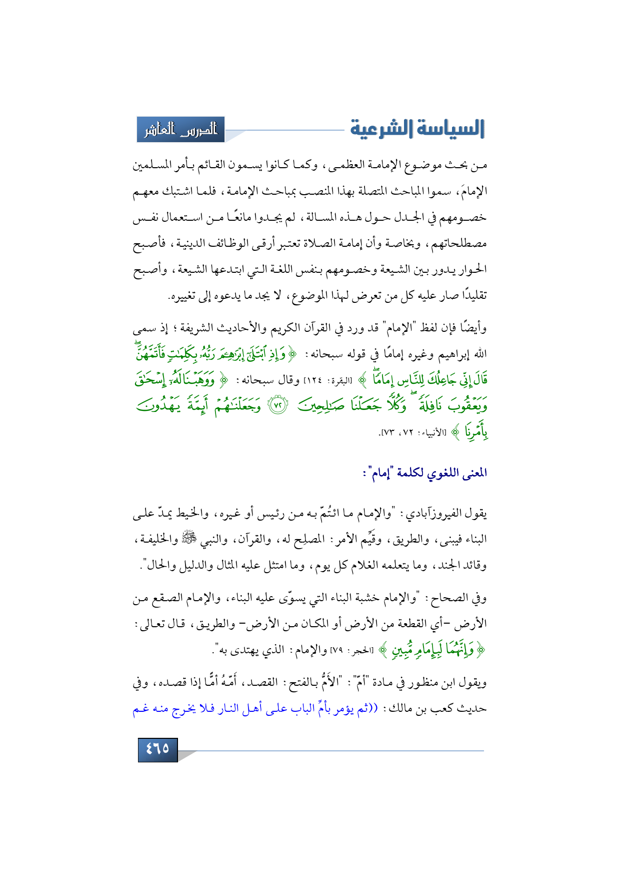 من بحث موضوع الإمامة العظمى، وكما كانوا يسمون القائم بأمر المسلمين الإمامَ، سموا المباحث المتصلة بهذا المنصب بمباحث الإمامة، فلما اشتبك معهم خصومهم في الجدل حول هذه المسالة، لم يجدوا مانعًا من استعمال نفس مصطلحاتهم، وبخاصة وأن إمامة الصلاة تعتبر أرقى الوظائف الدينية، فأصبح الحوار يدور بين الشيعة وخصومهم بنفس اللغة التي ابتدعها الشيعة، وأصبح تقليدًا صار عليه كل من تعرض لهذا الموضوع، لا يجد ما يدعوه إلى تغييره، وأيضًا فإن لفظ "الإمام" قد ورد في القرآن الكريم والأحاديث الشريفة؛ إذ سمى الله إبراهيم وغيره إمامًا في قوله سبحانه: {وَإِذْ ابْتَلَى إِبْرَاهِيمَ رَبُّهُ بِكَلِمَاتٍ فَأَتَمَّهُنَّ قَالَ إِنِّي جَاعِلُكَ لِلنَّاسِ إِمَاماً} (البقرة: من الآية: 124) وقال سبحانه: {وَوَهَبْنَا لَهُ إِسْحَقَ وَيَعْقُوبَ نَافِلَةً وَكُلاًّ جَعَلْنَا صَالِحِينَ وَجَعَلْنَاهُمْ أَئِمَّةً يَهْدُونَ بِأَمْرِنَا} (الأنبياء: 72 - 73)