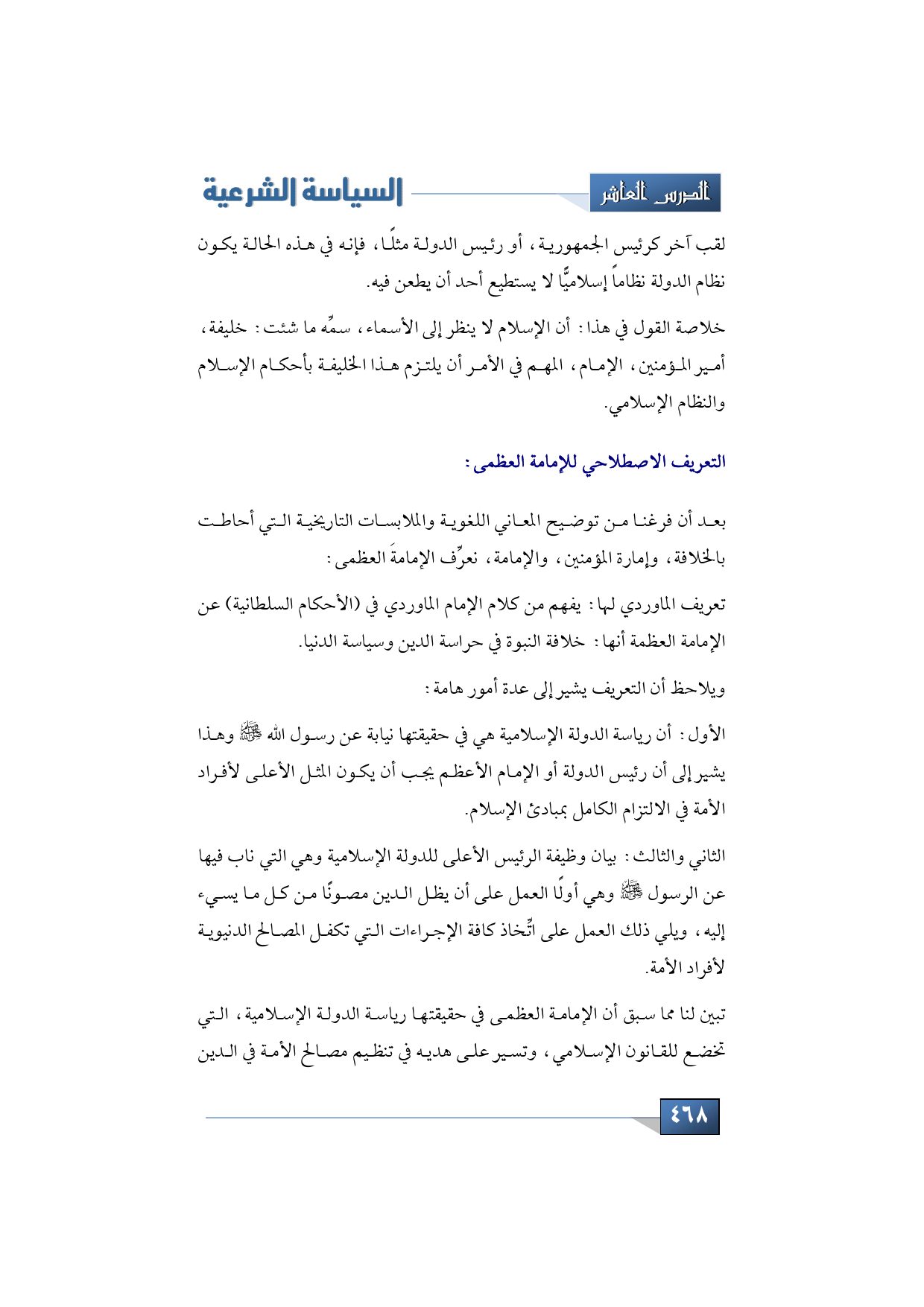 تبين لنا مما سبق أن الإمامة العظمى في حقيقتها رياسة الدولة الإسلامية، التي تخضع للقانون الإسلامي، وتسير على هديه في تنظيم مصالح الأمة في الدين