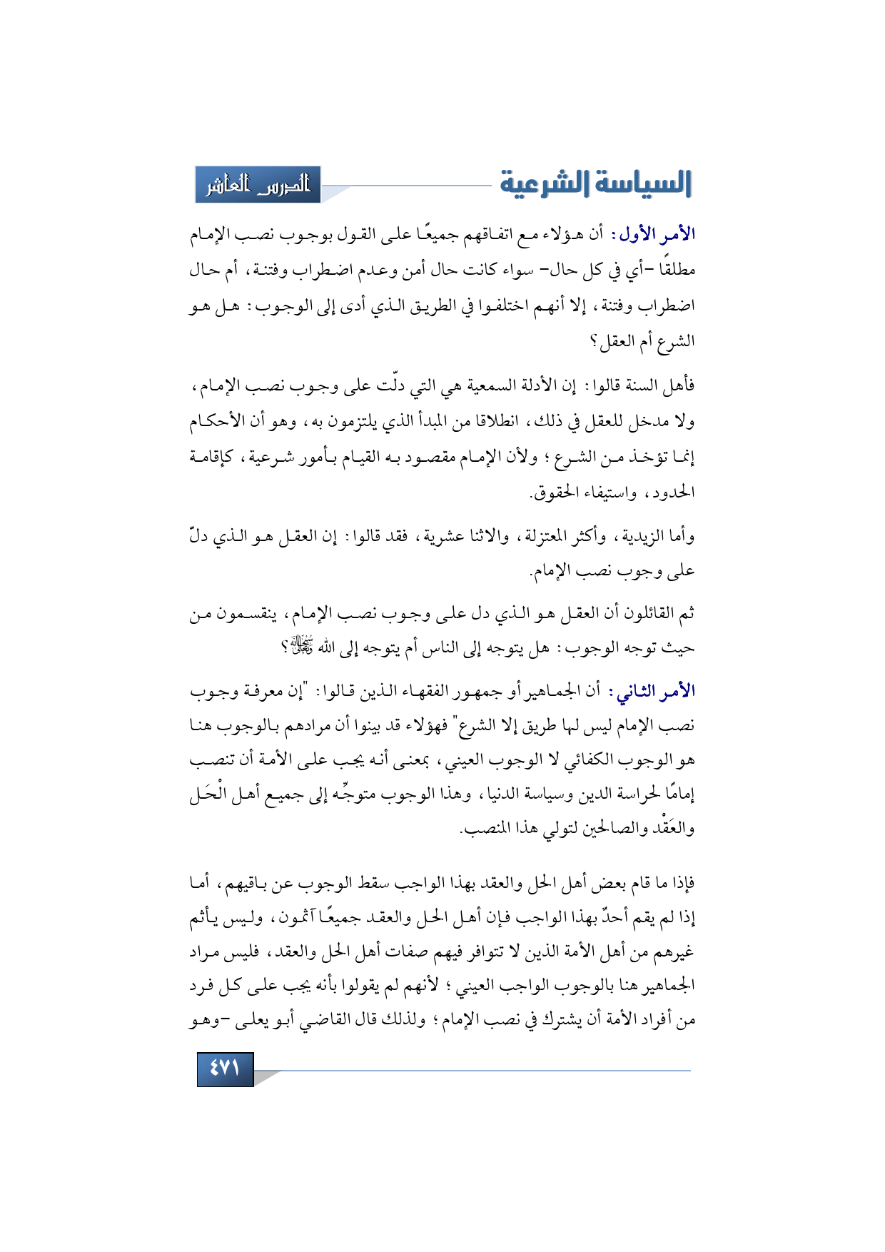 الأمر الأول: أن هؤلاء مع اتفاقهم جميعًا على القول بوجوب نصب الإمام مطلقًا -أي في كل حال- سواء كانت حال أمن وعدم اضطراب وفتنة، أم حال اضطراب وفتنة، إلا أنهم اختلفوا في الطريق الذي أدى إلى الوجوب: هل هو الشرع أم العقل؟