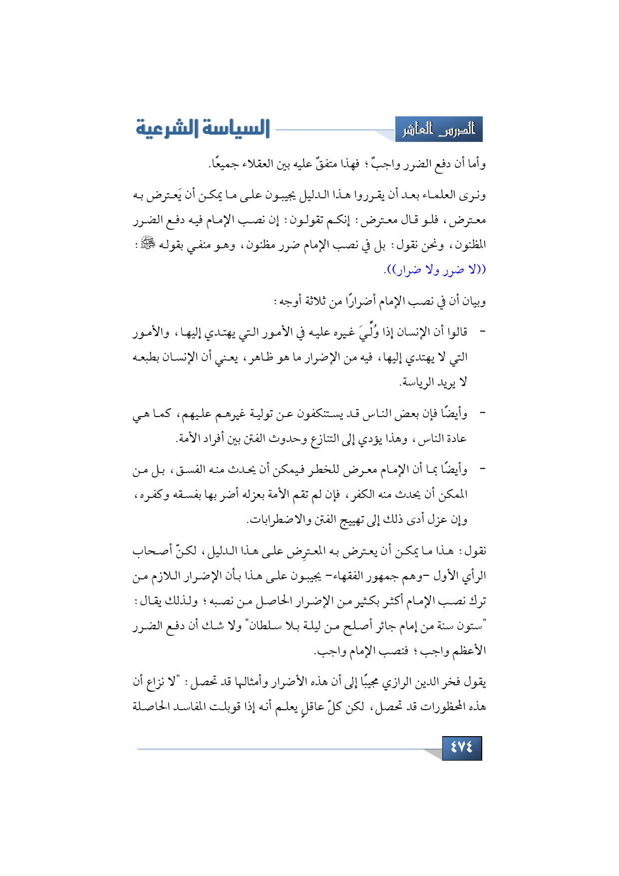وإما أن دفع الضرر واجبٌ؛ فهذا متفقٌ عليه بين العقلاء جميعًا، ونرى العلماء بعد أن يقرروا الدليل هكذا يجيبون على ما يمكن أن يَعترض به معترض، فيقول المعترض: إنكم تقولون: إن نصب الإمام فيه دفع الضرر المظنون، ونحن نقول: بل في نصب الإمام ضرر مظنون، وهو منفي بقوله -صلى الله عليه وسلم-: ((لا ضرر ولا ضرار)) وبيان أن في نصب الإمام أضرارًا من ثلاثة أوجه، أي أنهم يبيّنون أو أن جمهور الفقهاء يقولون بأن نصب الإمام فيه دفع للضرر المظنون؛ لأن الناس لا يستطيعون العيش في مجتمع إلا إذا وُجد من يقوم على أمرهم، ويمنع الظلم -أي ظلم بعضهم لبعض- ويؤدي الحقوق إلى أصحابها.