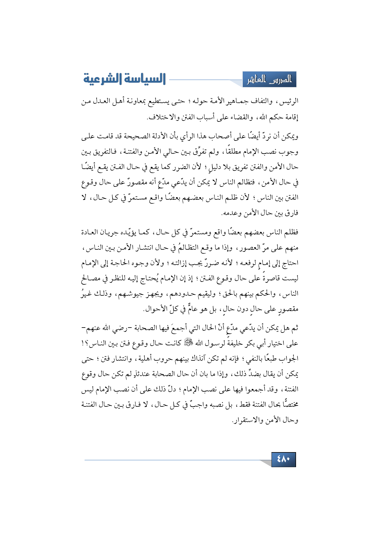 الرئيس، والتفاف جماهير الأمة حوله؛ حتى يستطيع بمعاونة أهل العدل من إقامة حكم الله، والقضاء على أسباب الفتن والاختلاف. هذا ردٌّ على من يقول بوجوب نصب الإمام عند ظهور العدل، ولا يجب نصبه عند ظهور الفتن.