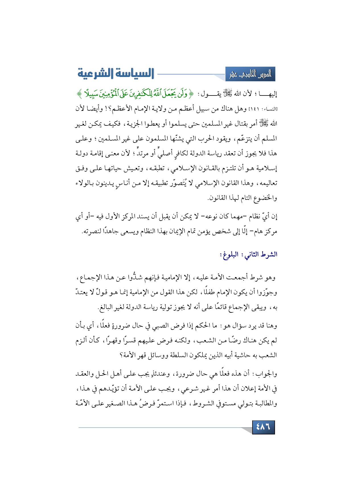 الشرط الثاني من الشروط التي يجب توافرها في الإمام أو رئيس الدولة، هو شرط أجمعت الأمة أيضًا عليه: وهو البلوغ، إلا الإمامية فإنهم شذُّوا عن هذا الإجماع، وجوّزوا أن يكون الإمام طفلًا، لكن هذا القول من الإمامية إنما هو قولٌ لا يعتدّ به، ويبقى الإجماع قائمًا على أنه لا يجوز تولية رياسة الدولة لغير البالغ.