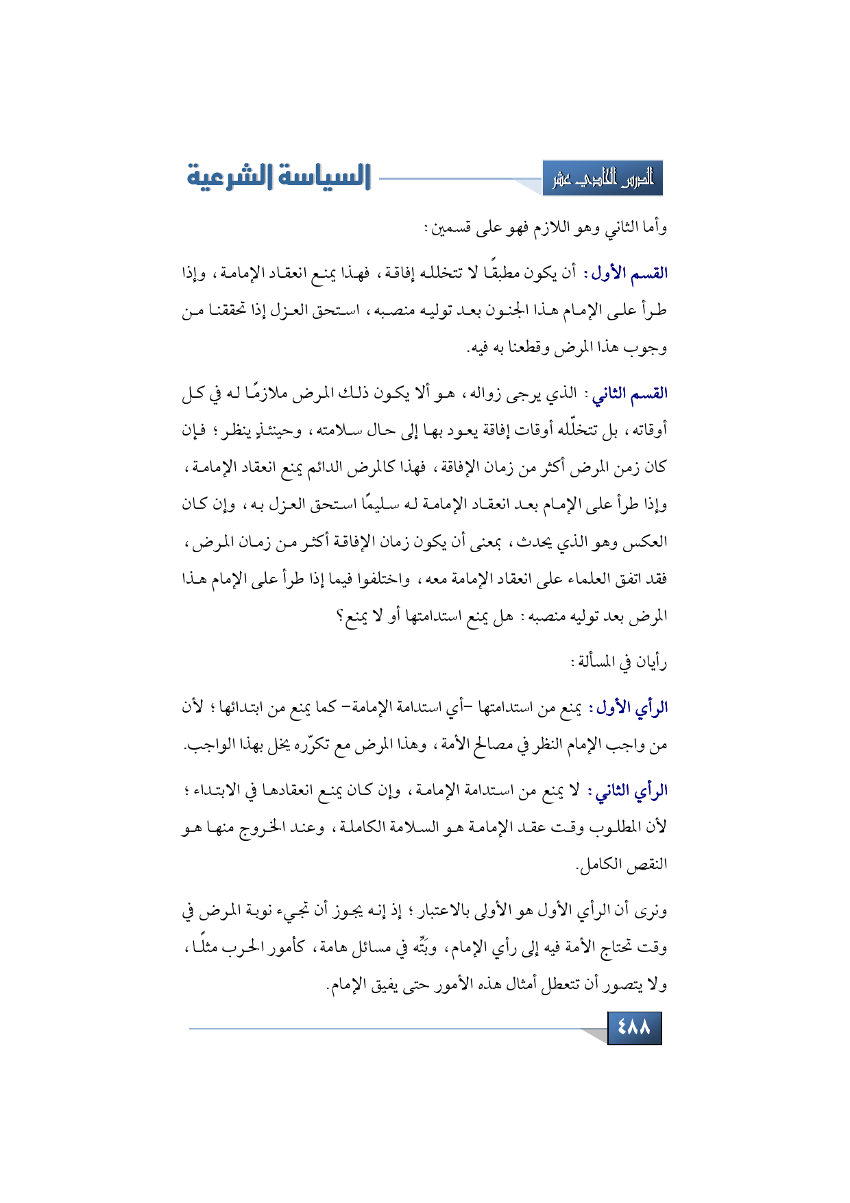 والقسم الثاني من اللازم -يعني المرض اللازم الملازم للإنسان- الذي يرجى زواله، هو ألا يكون ذلك المرض ملازمًا له في كل أوقاته، بل تتخلّله أوقات إفاقة يعود بها إلى حال سلامته، وحينئذٍ ينظر؛ فإن كان زمن المرض أكثر من زمان الإفاقة، فهذا كالمرض الدائم يمنع انعقاد الإمامة، وإذا طرأ على الإمام بعد انعقاد الإمامة له سليمًا استحق العزل به، وإن كان العكس وهو الذي يحدث، بمعنى أن يكون زمان الإفاقة أكثر من زمان المرض، فقد اتفق العلماء على انعقاد الإمامة معه، واختلفوا فيما إذا طرأ على الإمام هذا المرض بعد توليه منصبه: هل يمنع استدامتها أو لا يمنع؟