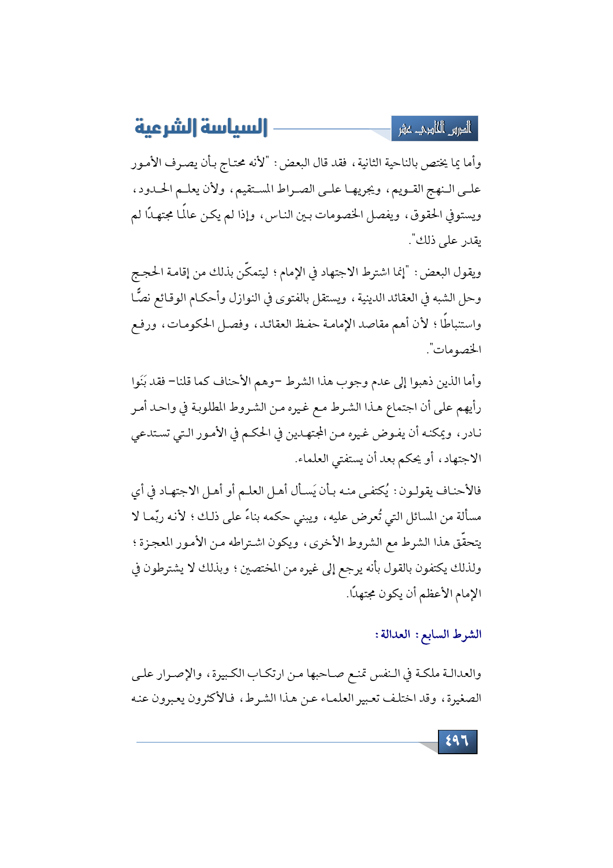 الشرط السابع من شروط الإمام الأعظم أو ورئيس الدولة: هو أن يكون عدلًا, والعدالة ملكة في النفس تمنع صاحبها من ارتكاب الكبيرة, والإصرار على الصغيرة, وقد اختلف تعبير العلماء عن هذا الشرط, فالأكثرون يعبرون عنه