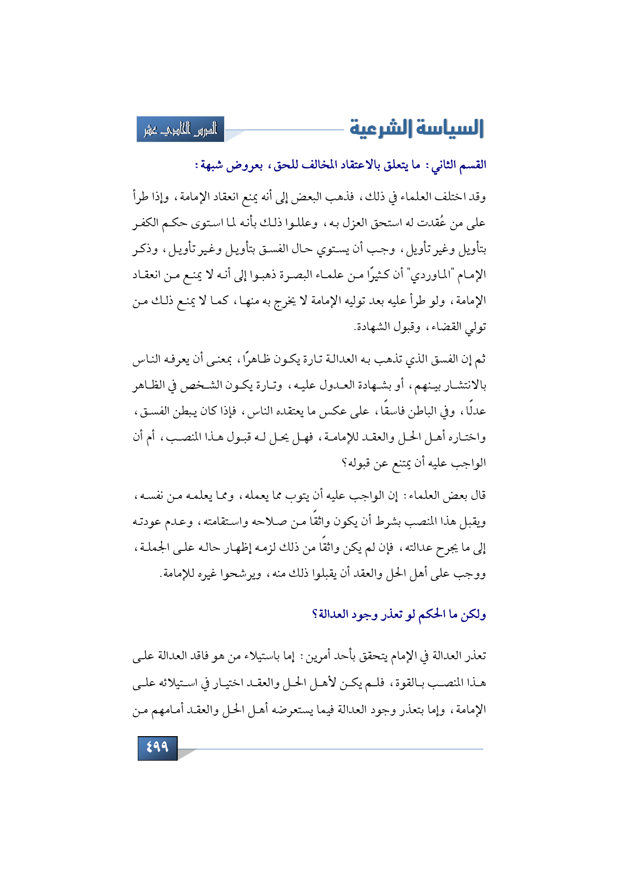 وأما الثاني من قسمي الفسق: فهو ما يتعلق بالاعتقاد المخالف للحق, بعروض شبهة, وقد اختلف العلماء في ذلك, فذهب البعض إلى أنه يمنع انعقاد الإمامة, وإذا طرأ على من عُقدت له استحق العزل به, وعللوا ذلك بأنه لما استوي حكم الكفر بتأويل وغير تأويل, وجب أن يستوي حال الفسق بتأويل وغير تأويل, وذكر الإمام الماوردي أن كثيرًا من علماء البصرة ذهبوا إلى أنه لا يمنع من انعقاد الإمامة, ولو طرأ عليه بعد توليه الإمامة لا يخرج به منها, كما لا يمنع ذلك من تولي القضاء, وقبول الشهادة.