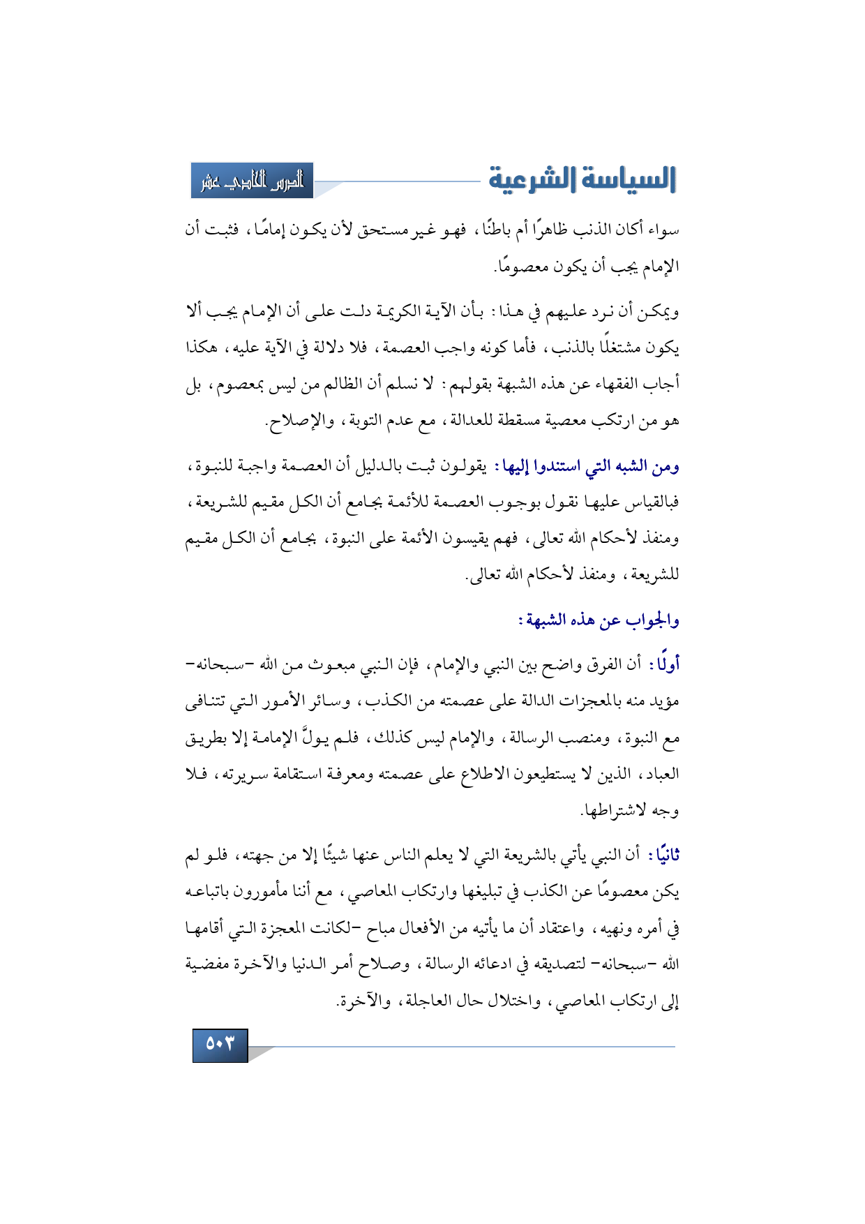 ومن الشبه التي استندوا إليها يقولون: ثبت بالدليل أن العصمة واجبة للنبوة, فبالقياس عليها نقول بوجوب العصمة للأئمة بجامع أن الكل مقيم للشريعة, ومنفذ لأحكام الله تعالى, هذه هي الشبهة الأخرى التي استندوا إليها, والتي يثبتون بها العصمة للأئمة, وهم يقيسون الأئمة على النبوة, بجامع أن الكل مقيم للشريعة, ومنفذ لأحكام الله تعالى.