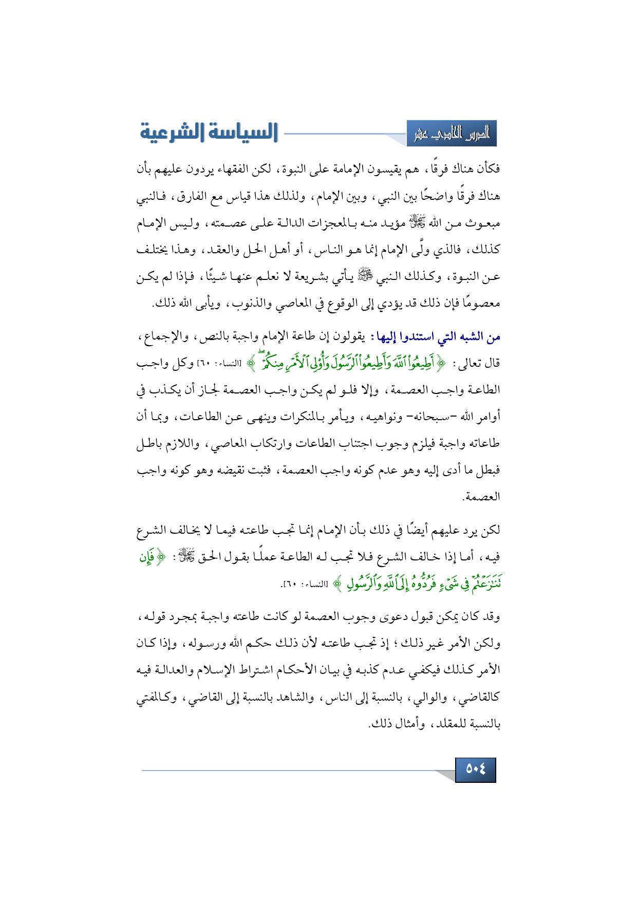 لكن يرد عليهم أيضًا في ذلك بأن الإمام إنما تجب طاعته فيما لا يخالف الشرع فيه, أما إذا خالف الشرع فلا تجب له الطاعة عملًا بقول الحق -سبحانه وتعالى: {فَإِنْ تَنَازَعْتُمْ فِي شَيْءٍ فَرُدُّوهُ إِلَى اللَّهِ وَالرَّسُول} (النساء: من الآية 59) وقد كان يمكن قبول دعوى وجوب العصمة لو كانت طاعته واجبة بمجرد قوله, ولكن الأمر غير ذلك؛ إذ تجب طاعته لأن ذلك حكم الله ورسوله, وإذا كان الأمر كذلك فيكفي عدم كذبه في بيان الأحكام اشتراط الإسلام والعدالة, فيه كالقاضي, والوالي, بالنسبة إلى الناس, والشاهد بالنسبة إلى القاضي, وكالمفتي بالنسبة للمقلد, وأمثال ذلك.