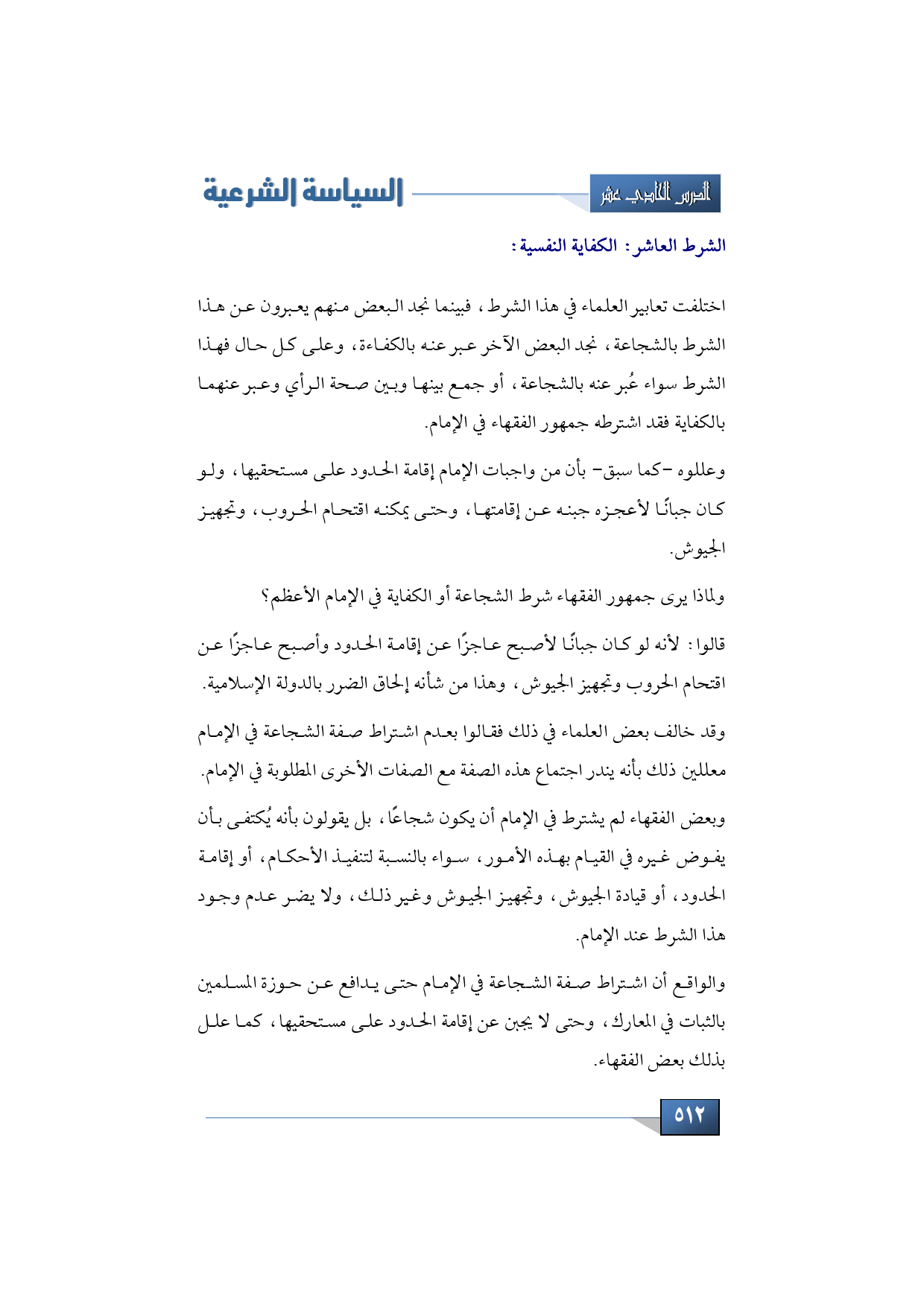 وننتقل بعد ذلك إلى الشرط العاشر من شروط الإمامة العظمى, أو الشروط التي يجب توافرها في رئيس الدولة, وهذا الشرط هو الكفاية النفسية, نقول: