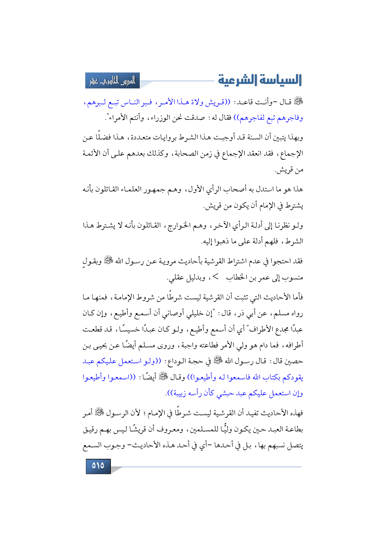 وبهذا يتبين أن السنة قد أوجبت هذا الشرط بروايات متعددة, هذا فضلًا عن الإجماع, فقد انعقد الإجماع في زمن الصحابة, وكذلك بعدهم على أن الأئمة من قريش.