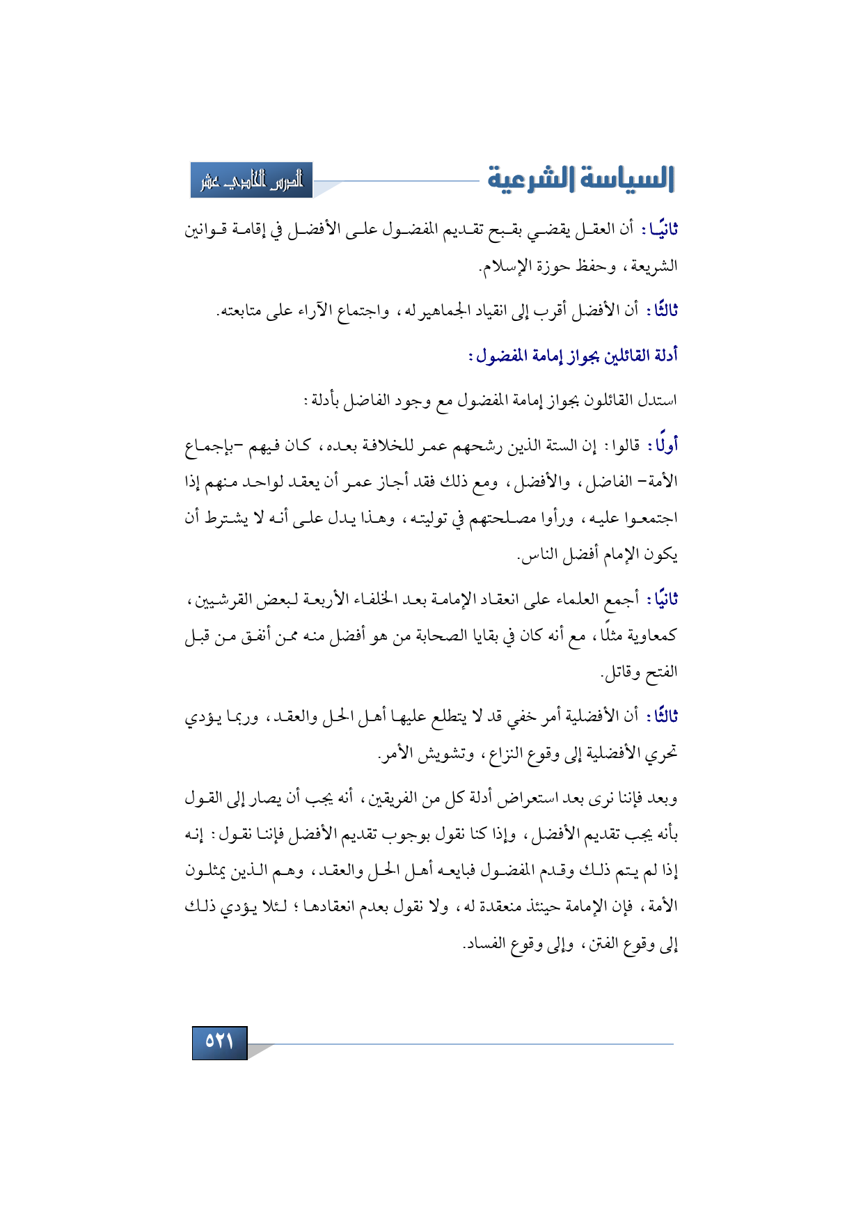 ثانيًا: أن العقل يقضي بقبح تقديم المفضول على الأفضل في إقامة قوانين الشريعة, وحفظ حوزة الإسلام.