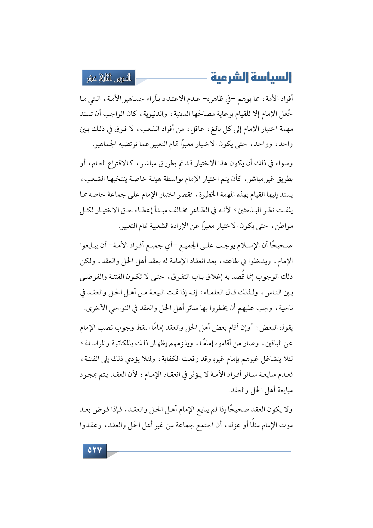 أفراد الأمة, مما يوهم -في ظاهره- عدم الاعتداد بآراء جماهير الأمة, التي ما جُعل الإمام إلا للقيام برعاية مصالحها الدينية, والدنيوية, كان الواجب أن تسند مهمة اختيار الإمام إلى كل بالغ, عاقل, من أفراد الشعب, لا فرق في ذلك بين واحد, وواحد, حتى يكون الاختيار معبرًا تمام التعبير عما ترتضيه الجماهير, وسواء في ذلك أن يكون هذا الاختيار قد تم بطريق مباشر, كالاقتراع العام, أو بطريق غير مباشر, كأن يتم اختيار الإمام بوساطة هيئة خاصة ينتخبها الشعب, يسند إليها القيام بهذه المهمة الخطيرة, فقصر اختيار الإمام على جماعة خاصة مما يلفت نظر الباحثين؛ لأنه في الظاهر مخالف مبدأ إعطاء حق الاختيار لكل مواطن, حتى يكون الاختيار معبرًا عن الإرادة الشعبية تمام التعبير.