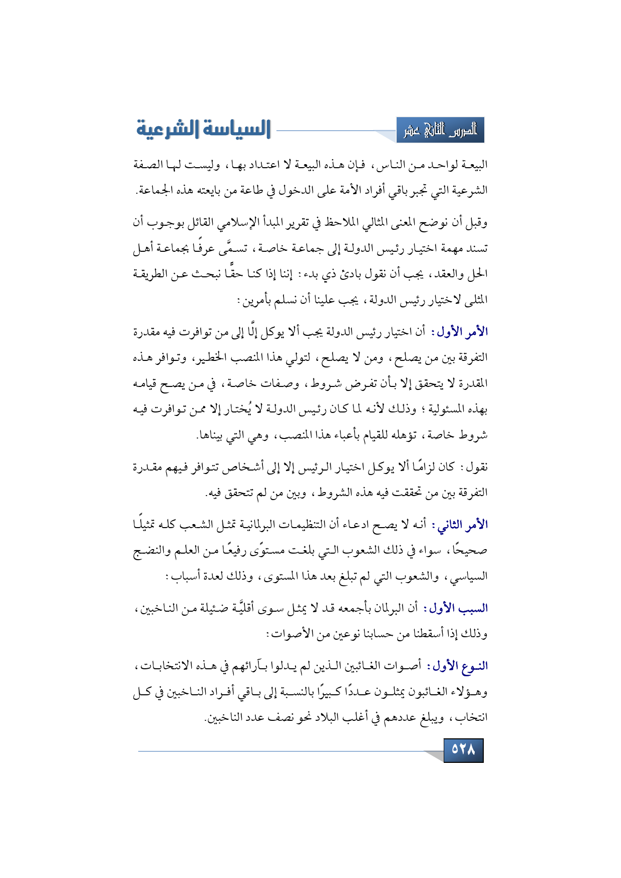 وقبل أن نوضح المعنى المثالي الملاحظ في تقرير المبدأ الإسلامي القائل بوجوب أن تسند مهمة اختيار رئيس الدولة إلى جماعة خاصة, تسمَّى عرفًا بجماعة أهل الحل والعقد, يجب أن نقول بادئ ذي بدء: إننا إذا كنا حقًا نبحث عن الطريقة المثلى لاختيار رئيس الدولة, يجب علينا أن نسلم بأمرين: