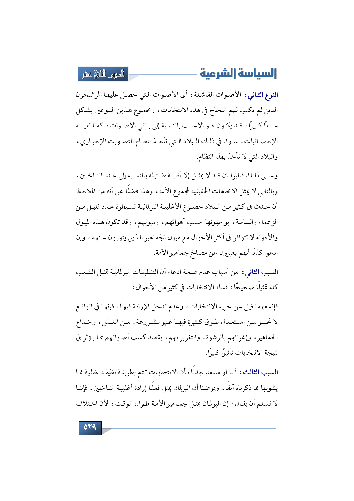 السبب الثالث: أننا لو سلمنا جدلًا بأن الانتخابات تتم بطريقة نظيفة خالية مما يشوبها مما ذكرناه آنفًا, وفرضنا أن البرلمان يمثل فعلًا إرادة أغلبية الناخبين, فإننا لا نسلم أن يقال: إن البرلمان يمثل جماهير الأمة طوال الوقت؛ لأن اختلاف