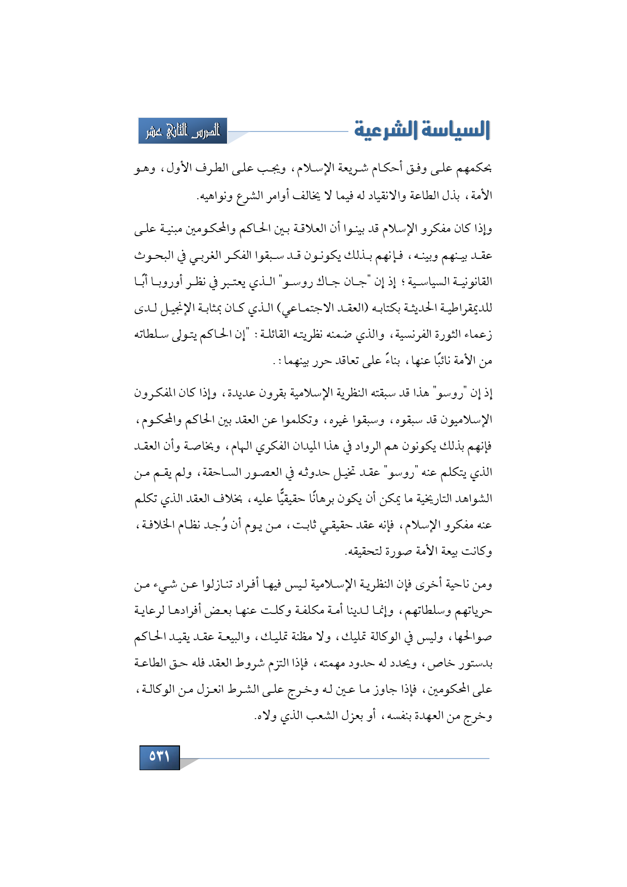 وإذا كان مفكرو الإسلام قد بينوا أن العلاقة بين الحاكم والمحكومين مبينة على عقد بينهم وبينه, فإنهم بذلك يكونون قد سبقوا الفكر الغربي في البحوث القانونية السياسية؛ إذ إن (جان جاك روسو) الذي يعتبر في نظر أوروبا أبًا لديمقراطية الحديثة بكتابه (العقد الاجتماعي) الذي كان بمثابة الإنجيل لدى زعماء الثورة الفرنسية, والذي ضمنه نظريته القائلة: إن الحاكم يتولى سلطاته من الأمة نائبًا عنها, بناءً على تعاقد حرر بنيهما, إذ إن (روسو) هذا قد سبقته النظرية الإسلامية بقرون عديدة, وإذا كان المفكرون الإسلاميون قد سبقوه, وسبقوا غيره, وتكلموا عن العقد بين الحاكم والمحكوم, فإنهم بذلك يكونون هم الرواد في هذا الميدان الفكري الهام, وبخاصة وأن العقد الذي يتكلم عنه (روسو) عقد تخيل حدوثه في العصور الساحقة, ولم يقم من الشواهد التاريخية ما يمكن أن يكون برهانًا حقيقيًّا عليه, بخلاف العقد الذي تكلم عنه مفكرو الإسلام, فإنه عقد حقيقي ثابت, من يوم أن وُجد نظام الخلافة, وكانت بيعة الأمة صورة لتحقيقه.