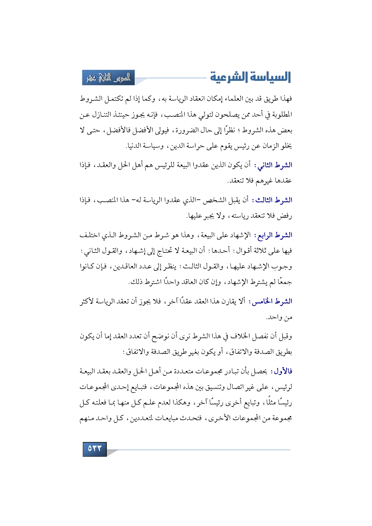 الشرط الثالث: أن يقبل الشخص الذين عقدوا الرياسة له, أن يقبل هذا المنصب, فإذا رفض فلا تنعقد رياسته, ولا يجبر عليها.