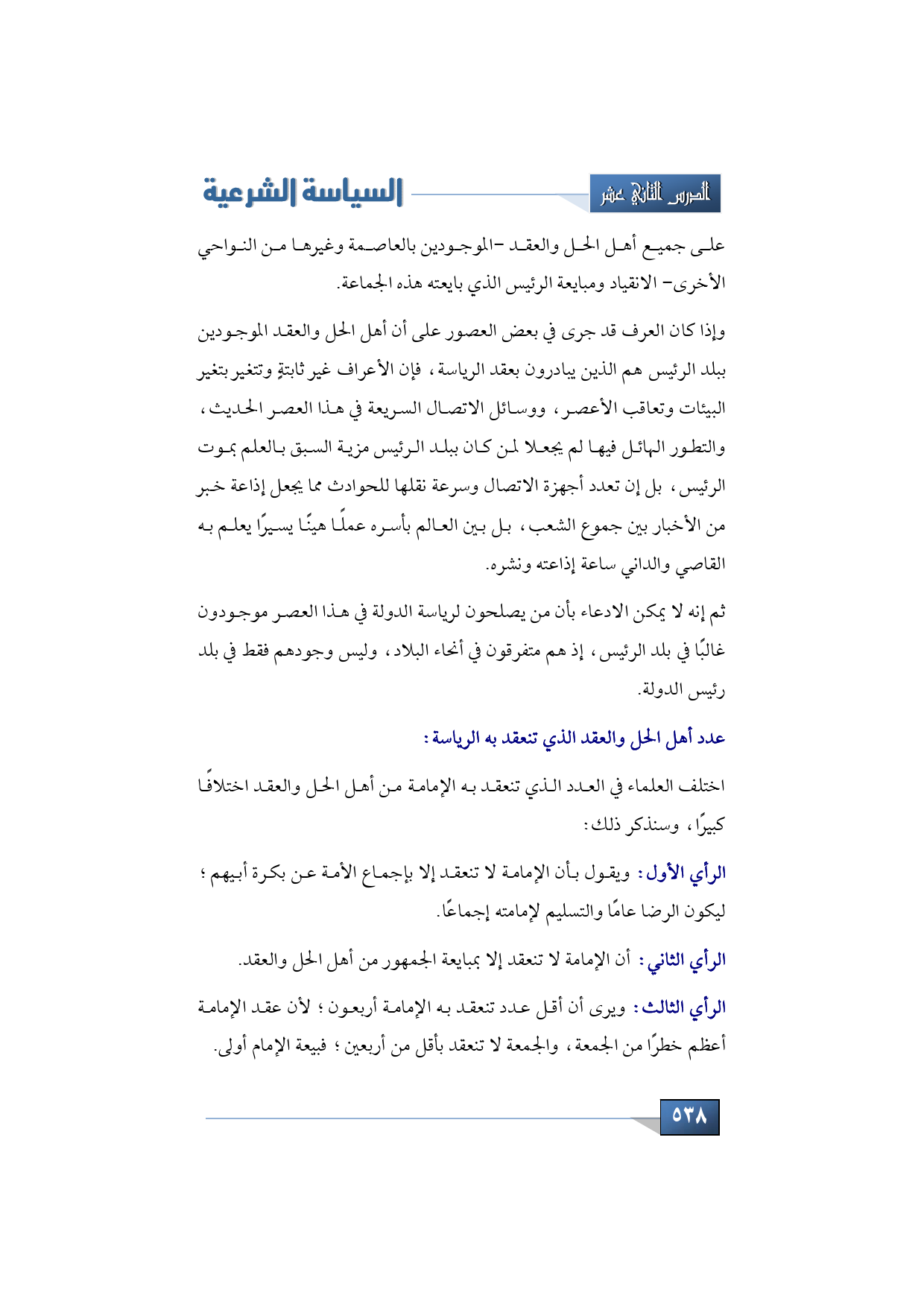 عدد أهل الحل والعقد الذي تنعقد به الرياسة: اختلف العلماء في العدد الذي تنعقد به الإمامة من أهل الحل والعقد اختلافًا كبيرًا، وسنذكر ذلك: