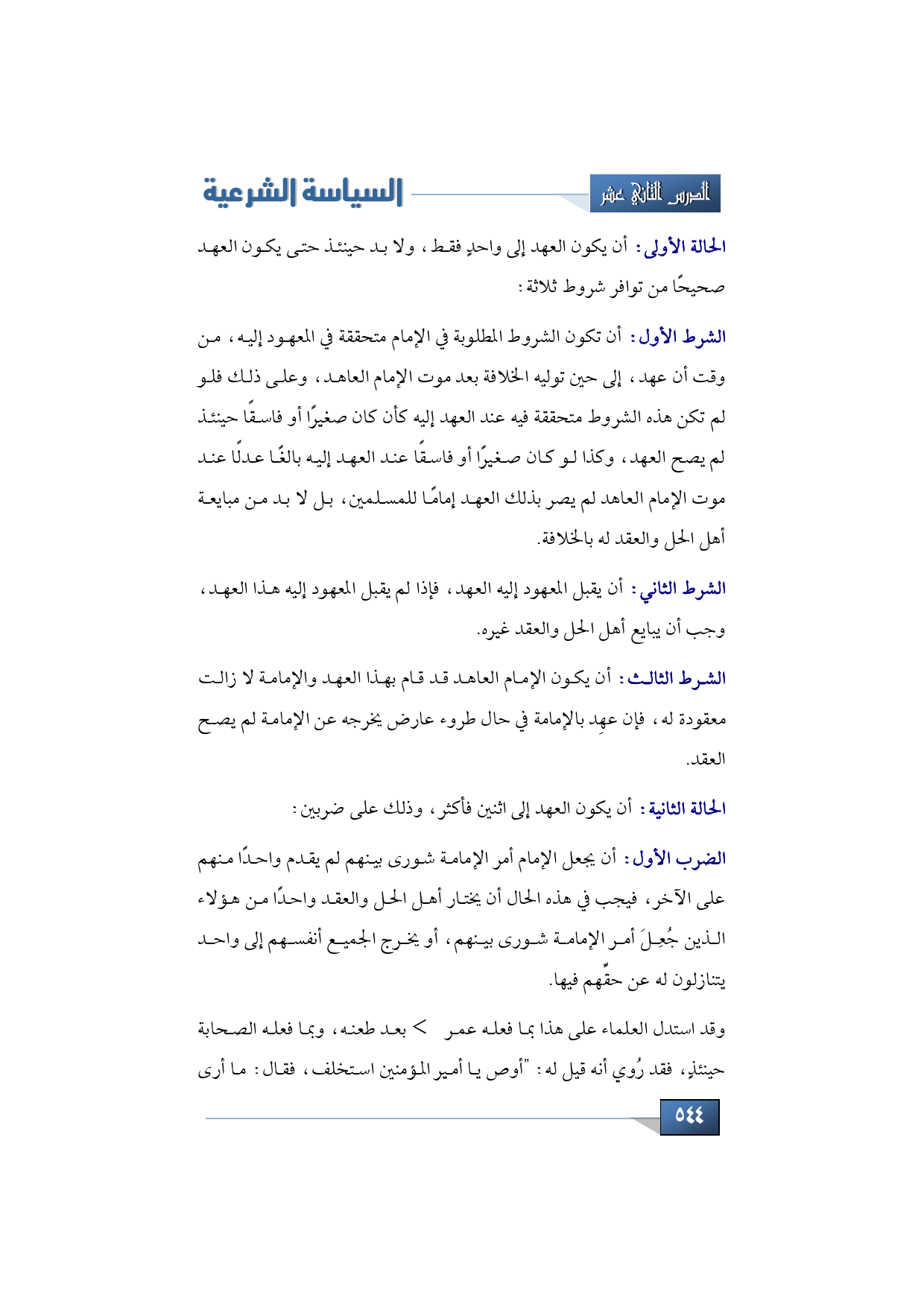 الشرط الثالث: أن يكون الإمام العاهد قد قام بهذا العهد والإمامة لا زالت معقودة له، فإن عهِد بالإمامة في حال طروء عارض يخرجه عن الإمامة لم يصح العقد.