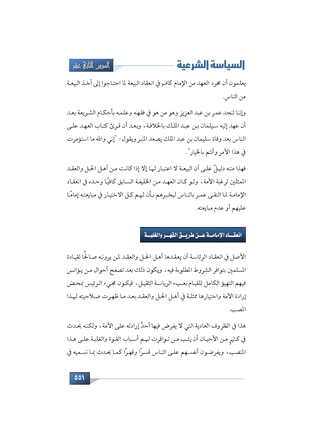 يعلمون أن مجرد العهد من الإمام كافٍ في انعقاد البيعة لما احتاجوا إلى أخذ البيعة من الناس، وإننا لنجد عمر بن عبد العزيز وهو من وهو في فقهه وعلمه بأحكام الشريعة بعد أن عهد إليه سيلمان بن عبد الملك بالخلافة، وبعد أن قرئ كتاب العهد على الناس بعد وفاة سليمان بن عبد الملك يصعد المنبر ويقول: "إني والله ما استؤمرت في هذا الأمر وأنتم بالخيار". فهذا منه دليلٌ على أن البيعة لا اعتبار لها إلا إذا كانت من أهل الحل والعقد الممثلين لرغبة الأمة، ولو كان العهد من الخليفة السابق كافيًا وحده في انعقاد الإمامة لما التقى عمر بالناس ليخبرهم بأن لهم كل الاختيار في مبايعته إمامًا عليهم أو عدم مبايعته.