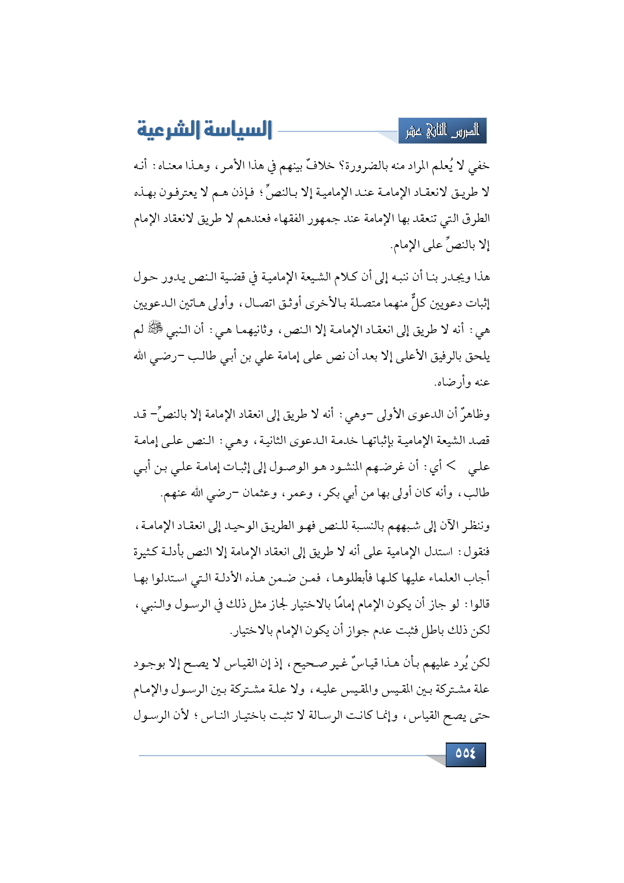 وننظر الآن إلى شبههم بالنسبة لأن النص إنما هو الطرق الوحيد إلى انعقاد الإمامة، فنقول: استدل الإمام على أنه لا طريق إلى انعقاد الإمامة إلا النص بأدلة كثيرة أجاب العلماء عليها كلها فأبطلوها، فمن ضمن هذه الأدلة التي استدلوا بها قالوا: استدلوا بها على أن النص هو الطريق الوحيد إلى انعقاد الإمامة، فقالوا: لو جاز أن يكون الإمام إمامًا بالاختيار لجاز مثل ذلك في الرسول والنبي، لكن ذلك باطل فثبت عدم جواز أن يكون الإمام بالاختيار، لكن يُرد عليهم بأن هذا قياسٌ غير صحيح، إذ أن القياس لا يصح إلا بوجود علة مشتركة بين المقيس والمقيس عليه، ولا علة مشتركة بين الرسول والإمام حتى يصح القياس، وإنما كانت الرسالة لا تثبت باختيار الناس؛ لأن الرسول