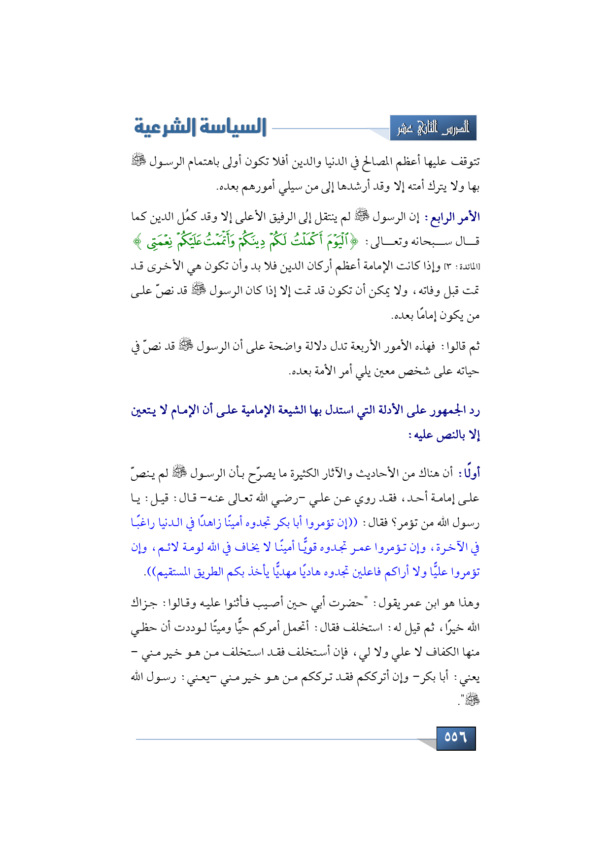 وأما الأمر الرابع الذي استدلوا به على نصّ النبي -صلى الله عليه وسلم- على الإمام قالوا: إن الرسول -صلى الله عليه وسلم- لم ينتقل إلى الرفيق الأعلى إلا وقد كمُل الدين كما قال سبحانه وتعالى: {الْيَوْمَ أَكْمَلْتُ لَكُمْ دِينَكُمْ وَأَتْمَمْتُ عَلَيْكُمْ نِعْمَتِي} (المائدة: من الآية 3) وإذا كانت الإمامة أعظم أركان الدين فلا بد وأن تكون هي الأخرى قد تمت قبل وفاته، ولا يمكن أن تكون قد تمت إلا إذا كان الرسول -صلى الله عليه وسلم- قد نصّ على من يكون إمامًا بعده.