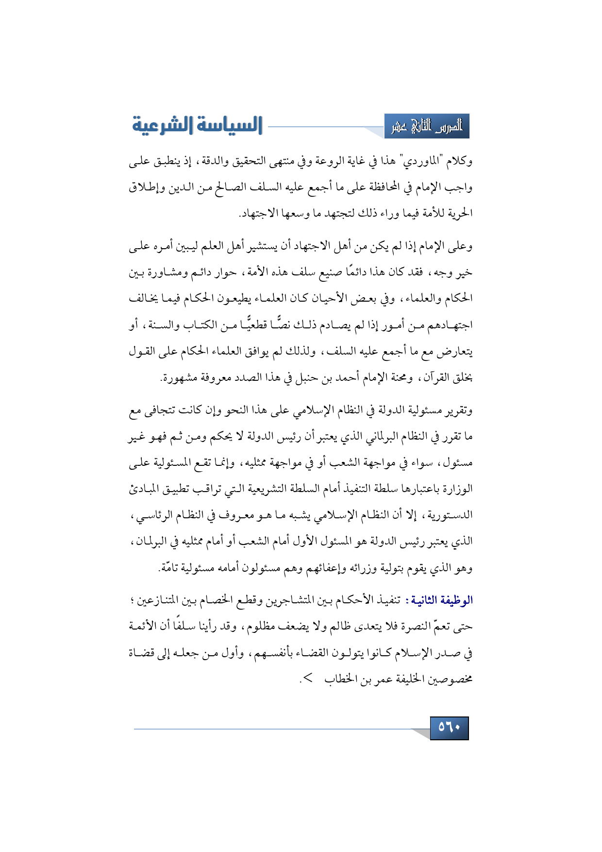 وكلام الماوردي هذا في غاية الروعة وفي منتهى التحقيق والدقة، إذ ينطبق على واجب الإمام في المحافظة على ما أجمع عليه السلف الصالح من الدين وإطلاق الحرية للأمة فيما وراء ذلك لتجتهد ما وسعها الاجتهاد، وعلى الإمام إذا لم يكن من أهل الاجتهاد أن يستشير أهل العلم ليبين أمره على خير وجه، فقد كان هذا دائمًا صنيع سلف هذه الأمة، حوار دائم ومشاورة بين الحكام والعلماء، وفي بعض الأحيان كان العلماء يطيعون الحكام فيما يخالف اجتهادهم من أمور إذا لم يصادم ذلك نصًّا قطعيًّا من الكتاب والسنة، أو يتعارض مع ما أجمع عليه السلف، ولذلك لم يوافق العلماء الحكام على القول بخلق القرآن، ومحنة الإمام أحمد بن حنبل في هذا الصدد معروفة مشهورة.