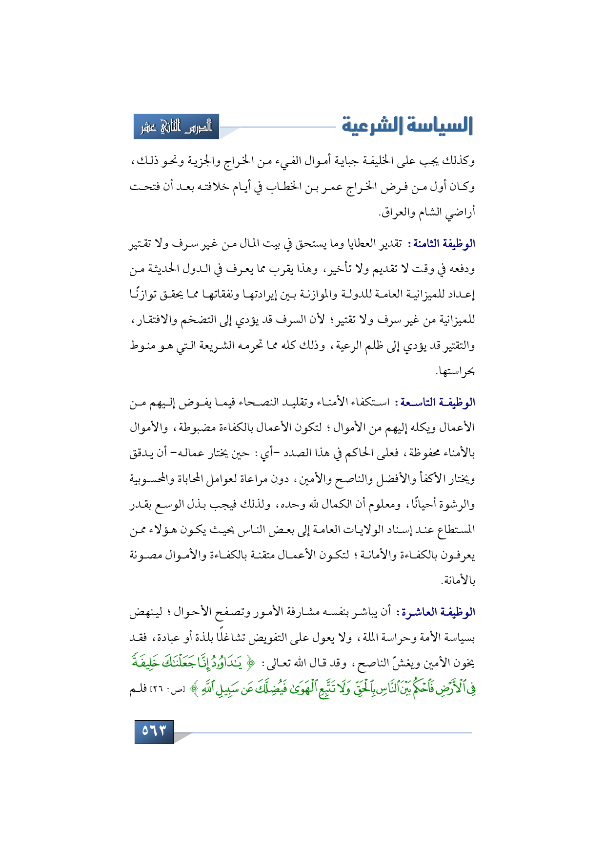 الوظيفة العاشرة: أن يباشر بنفسه مشارفة الأمور وتصفح الأحوال؛ لينهض بسياسة الأمة وحراسة الملة، ولا يعول على التفويض تشاغلًا بلذة أو عبادة، فقد يخون الأمين ويغشّ الناصح، وقد قال الله تعالى: {يَا دَاوُودُ إِنَّا جَعَلْنَاكَ خَلِيفَةً فِي الأَرْضِ فَاحْكُمْ بَيْنَ النَّاسِ بِالْحَقِّ وَلا تَتَّبِعِ الْهَوَى فَيُضِلَّكَ عَنْ سَبِيلِ اللَّهِ} (ص: من الآية: 26) فلم