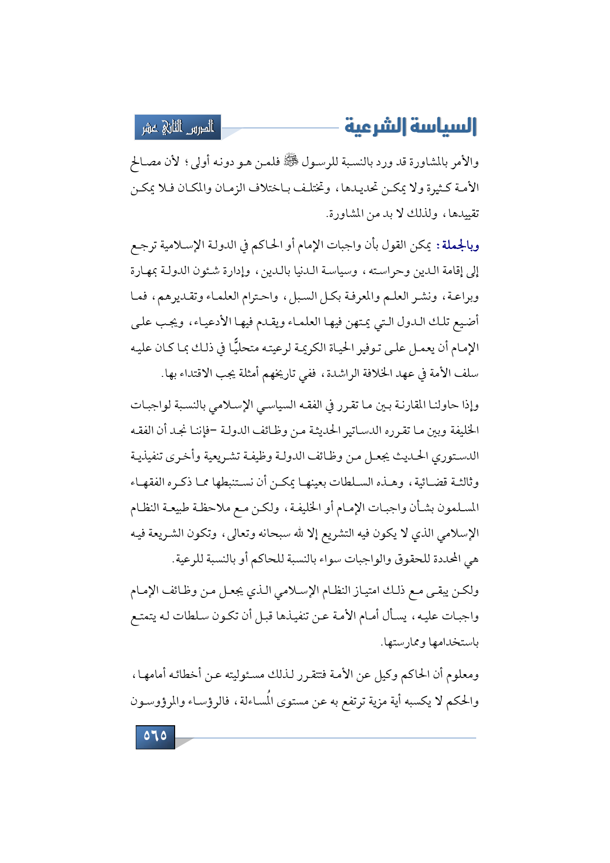 وبالجملة يمكن القول بأن واجبات الإمام أو الحاكم في الدولة الإسلامية ترجع إلى إقامة الدين وحراسته، وسياسة الدنيا بالدين، وإدارة شئون الدولة بمهارة وبراعة، ونشر العلم والمعرفة بكل السبل، واحترام العلماء وتقديرهم، فما أضيع تلك الدول التي يمتهن فيها العلماء ويقدم فيها الأدعياء، ويجب على الإمام أن يعمل على توفير الحياة الكريمة لرعيته متحليًّا في ذلك بما كان عليه سلف الأمة في عهد الخلافة الراشدة، ففي تاريخهم أمثلة يجب الاقتداء بها.