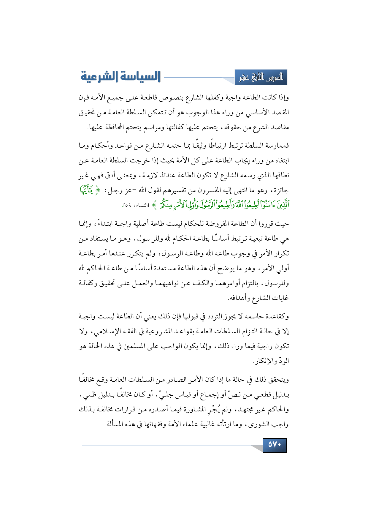 وإذا كانت الطاعة واجبة وكفلها الشارع بنصوص قاطعة على جميع الأمة فإن المقصد الأساسي من وراء هذا الوجوب هو أن تتمكن السلطة العامة من تحقيق مقاصد الشرع من حقوقه، يتحتم عليها كفالتها ومراسم يتحتم المحافظة عليها، فممارسة السلطة ترتبط ارتباطًا وثيقًا بما حتمه الشارع من قواعد وأحكام وما ابتغاه من وراء إيجاب الطاعة على كل الأمة بحيث إذا خرجت السلطة العامة عن نطاقها الذي رسمه الشارع لا تكون الطاعة عندئذ لازمة، وبمعنى أدق فهي غير جائزة، وهو ما انتهى إليه المفسرون من تفسيرهم لقول الله -عز وجل-: {يَا أَيُّهَا الَّذِينَ آمَنُوا أَطِيعُوا اللَّهَ وَأَطِيعُوا الرَّسُولَ وَأُوْلِي الأَمْرِ مِنْكُمْ} حيث قرروا أن الطاعة المفروضة للحكام ليست طاعة أصلية واجبة ابتداءً، وإنما هي طاعة تبعية ترتبط أساسًا بطاعة الحكام لله وللرسول، وهو ما يستفاد من تكرار الأمر في وجوب طاعة الله وطاعة الرسول، ولم يتكرر عندما أمر بطاعة أولي الأمر، وهو ما يوضح أن هذه الطاعة مستمدة أساسًا من طاعة الحاكم لله وللرسول، بالتزام أوامرهما والكف عن نواهيهما والعمل على تحقيق وكفالة غايات الشارع وأهدافه، وكقاعدة حاسمة لا يجوز التردد في قبولها فإن ذلك يعني أن الطاعة ليست واجبة إلا في حالة التزام السلطات العامة بقواعد المشروعية في الفقه الإسلامي، ولا تكون واجبة فيما وراء ذلك وإنما يكون الواجب على المسلمين في هذه الحالة هو الردّ والإنكار، ويتحقق ذلك في حالة ما إذا كان الأمر الصادر من السلطات العامة وقع مخالفًا بدليل قطعي من نصّ أو إجماع أو قياس جليّ، أو كان مخالفًا بدليل ظنيوالحاكم غير مجتهد ولم يجر المشاورة فيما أصدره من قرارات مخالفة بذلك واجب الشورى، وما ارتأته غالبية علماء الأمة وفقهائها في هذه المسألة،