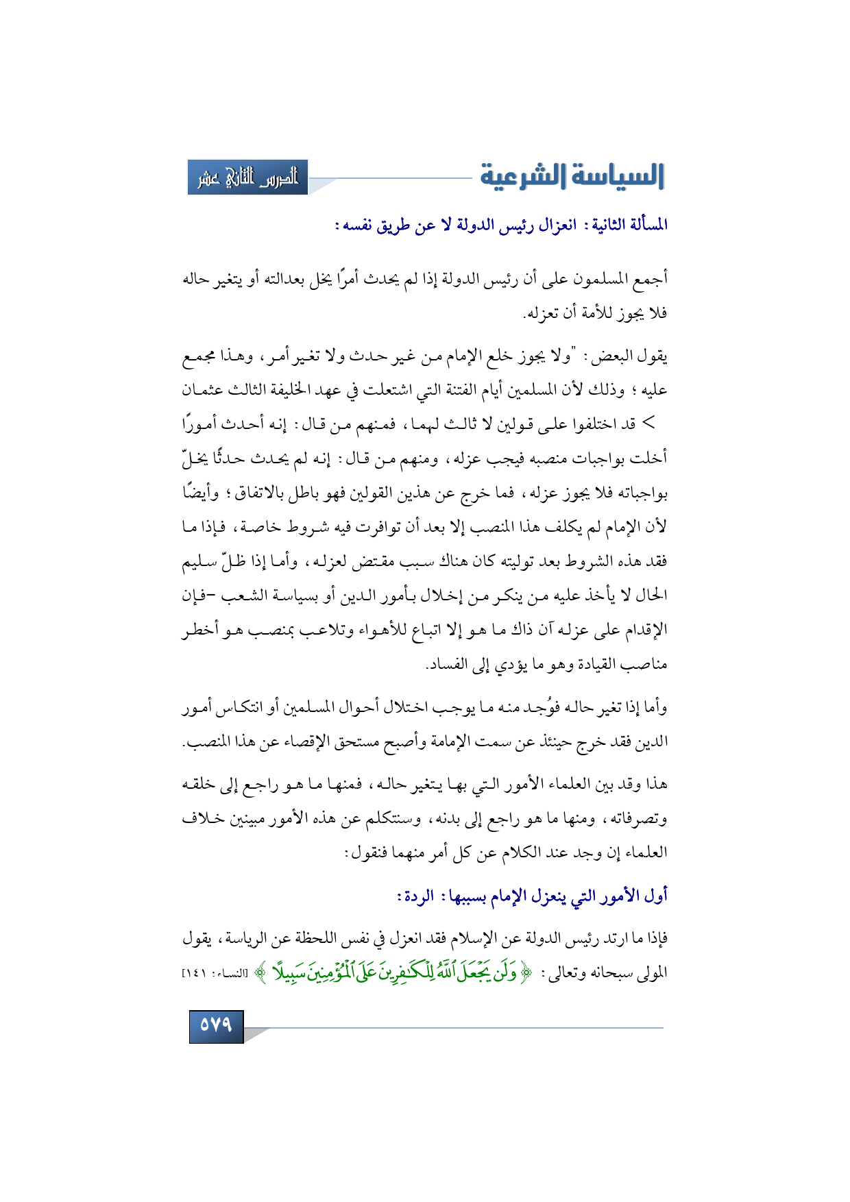 أول الأمور التي تخل بعقد الإمامة فينعزل الإمام بسببها هو: الردة، فإذا ما ارتد رئيس الدولة عن الإسلام فقد انعزل في نفس اللحظة عن الرياسة، يقول المولى سبحانه وتعالى: {وَلَنْ يَجْعَلَ اللَّهُ لِلْكَافِرِينَ عَلَى الْمُؤْمِنِينَ سَبِيلًا} (النساء: من الآية 141)