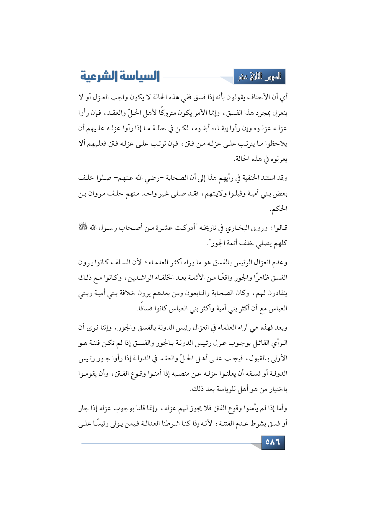 وعدم انعزال الرئيس بالفسق هو ما يراه أكثر العلماء؛ لأن السلف كانوا يرون الفسق ظاهرًا والجور واقعًا من الأئمة بعد الخلفاء الراشدين، وكانوا مع ذلك ينقادون لهم، وكان الصحابة والتابعون ومن بعدهم يرون خلافة بني أمية وبني العباس مع أن أكثر بني أمية وأكثر بني العباس كانوا فساقًا.