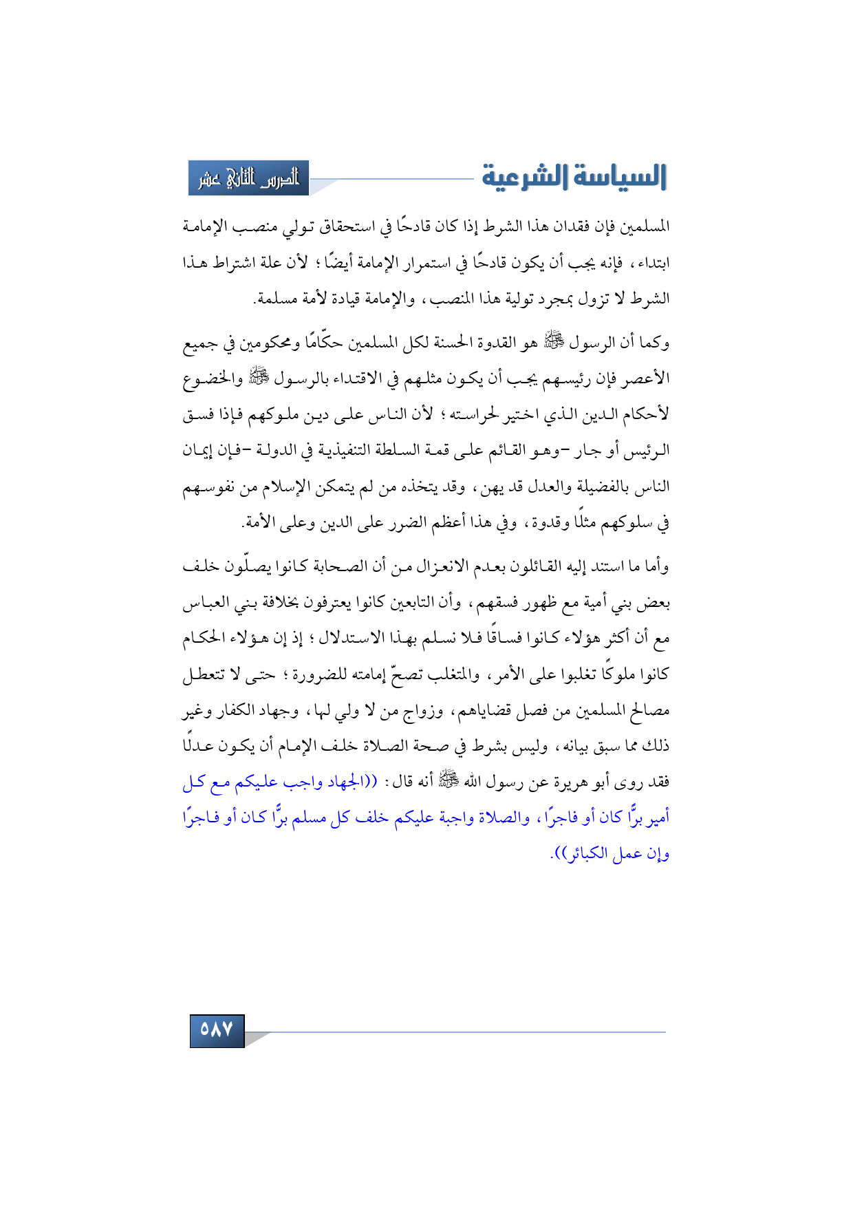 المسلمين فإن فقدان هذا الشرط إذا كان قادحًا في استحقاق تولي منصب الإمامة ابتداء، فإنه يجب أن يكون قادحًا في استمرار الإمامة أيضًا؛ لأن علة اشتراط هذا الشرط لا تزول بمجرد تولية هذا المنصب والإمامة قيادة لأمة مسلمة، وكما أن الرسول -صلى الله عليه وسلم- هو القدوة الحسنة لكل المسلمين حكّامًا ومحكومين في جميع الأعصر فإن رئيسهم يجب أن يكون مثلهم في الاقتداء بالرسول -صلى الله عليه وسلم- والخضوع لأحكام الدين الذي اختير لحراسته؛ لأن الناس على دين ملوكهم فإذا فسق الرئيس أو جار وهو القائم على قمة السلطة التنفيذية في الدولة -فإن إيمان الناس بالفضيلة والعدل قد يهن، وقد يتخذه من لم يتمكن الإسلام من نفوسهم في سلوكهم مثلًا وقدوة، وفي هذا أعظم الضرر على الدين وعلى الأمة.