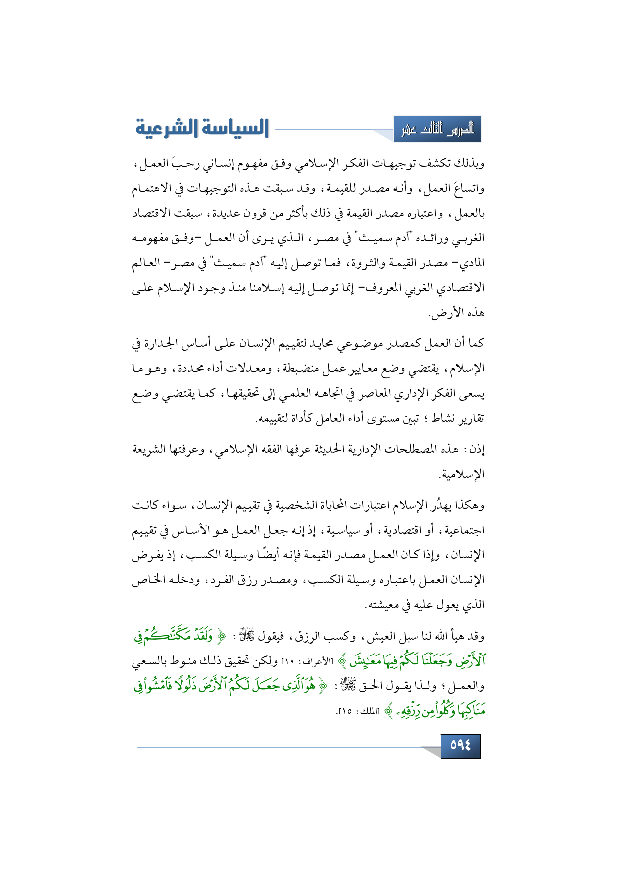 وبذلك تكشف توجيهات الفكر الإسلامي وفق مفهوم إنساني رحبَ العمل، واتساعَ العمل، وأنه مصدر للقيمة، وقد سبقت هذه التوجيهات في الاهتمام بالعمل، واعتباره مصدر القيمة في ذلك بأكثر من قرون عديدة، سبقت الاقتصاد الغربي ورائده "آدم سميث" في مصر، الذي يرى أن العمل -وفق مفهومه المادي- مصدر القيمة والثروة، فما توصل إليه "آدم سميث" في مصر- العالم الاقتصادي الغربي المعروف- إنما توصل إليه إسلامنا منذ وجود الإسلام على هذه الأرض.