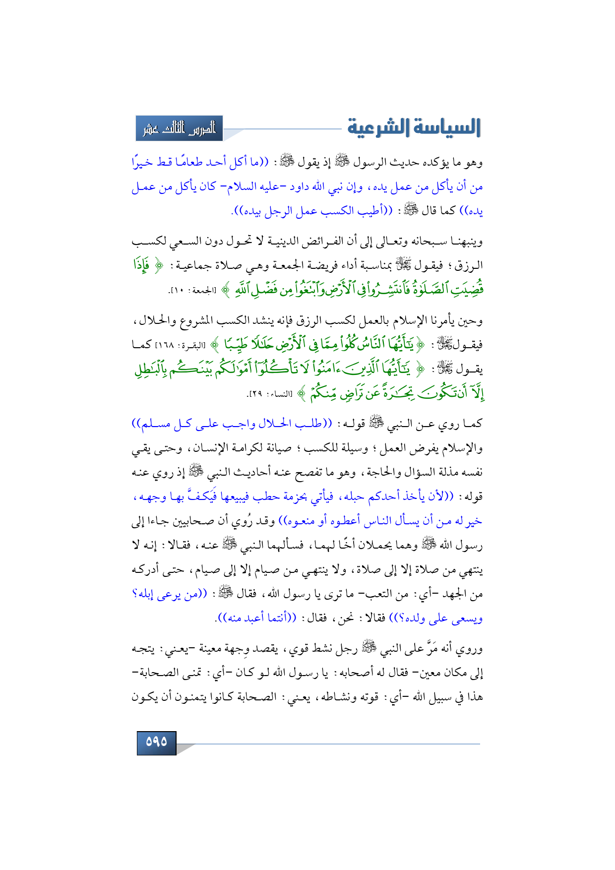 وهو ما يؤكده حديث الرسول -صلى الله عليه وسلم- إذ يقول -صلى الله عليه وسلم-: ((ما أكل أحد طعامًا قط خيرًا من أن يأكل من عمل يده، وإن نبي الله داود -عليه السلام- كان يأكل من عمل يده)) كما قال -صلى الله عليه وسلم-: ((أطيب الكسب عمل الرجل بيده)) وينبهنا سبحانه وتعالى إلى أن الفرائض الدينية لا تحول دون السعي لكسب الرزق؛ فيقول -سبحانه وتعالى- بمناسبة أداء فريضة الجمعة وهي صلاة جماعية: {فَإِذَا قُضِيَتِ الصَّلاةُ فَانتَشِرُوا فِي الأَرْضِ وَابْتَغُوا مِنْ فَضْلِ اللَّهِ} (الجمعة: 10) وحين يأمرنا الإسلام بالعمل لكسب الرزق فإنه ينشد الكسب المشروع والحلال، فيقول- سبحانه وتعالى-: {يَا أَيُّهَا النَّاسُ كُلُوا مِمَّا فِي الأَرْضِ حَلالًا طَيِّبًا} (البقرة: من الآية: 168) كما يقول -تبارك وتعالى-: {يَا أَيُّهَا الَّذِينَ آمَنُوا لا تَأْكُلُوا أَمْوَالَكُمْ بَيْنَكُمْ بِالْبَاطِلِ إِلاَّ أَنْ تَكُونَ تِجَارَةً عَنْ تَرَاضٍ مِنْكُمْ} (النساء: من الآية: 29).