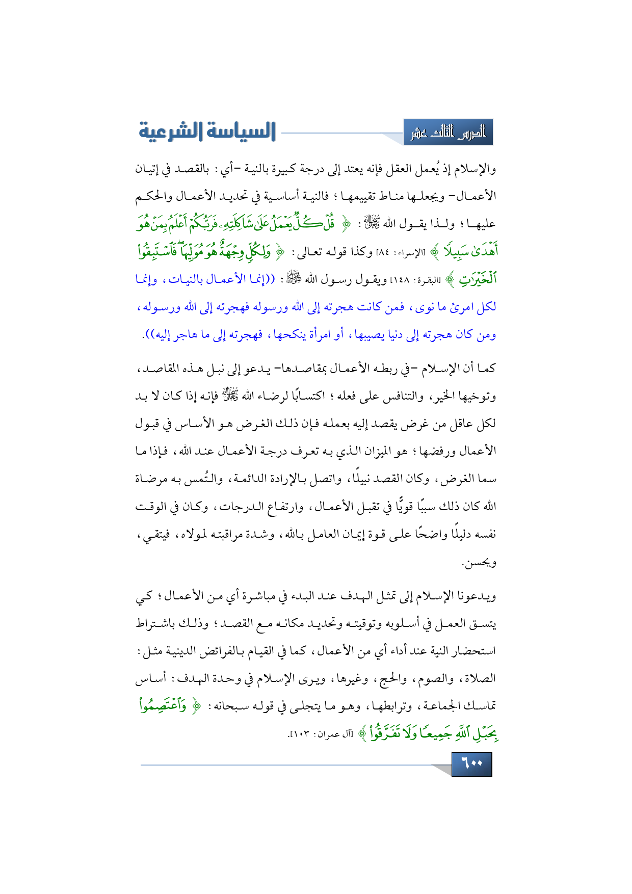 والإسلام إذ يُعمل العقل فإنه يعتد إلى درجة كبيرة بالنية -أي: بالقصد في إتيان الأعمال- ويجعلها مناط تقييمها؛ فالنية أساسية في تحديد الأعمال والحكم عليها؛ ولذا يقول الله -تبارك وتعالى-: {قُلْ كُلٌّ يَعْمَلُ عَلَى شَاكِلَتِهِ فَرَبُّكُمْ أَعْلَمُ بِمَنْ هُوَ أَهْدَى سَبِيلًا} (الإسراء: 84) وكذا قوله تعالى {وَلِكُلٍّ وِجْهَةٌ هُوَ مُوَلِّيهَا فَاسْتَبِقُوا الْخَيْرَاتِ} (البقرة: من الآية 148) ويقول رسول الله -صلى الله عليه وسلم-: ((إنما الأعمال بالنيات، وإنما لكل امرئ ما نوى، فمن كانت هجرته إلى الله ورسوله فهجرته إلى الله ورسوله، ومن كان هجرته إلى دنيا يصيبها، أو امرأة ينكحها، فهجرته إلى ما هاجر إليها)).