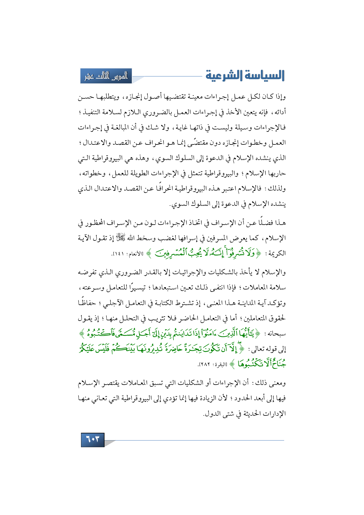 هذا فضلًا عن أن الإسراف في اتخاذ الإجراءات لون من الإسراف المحظور في الإسلام، كما يعرض المسرفين في إسرافها لغضب وسخط الله -سبحانه وتعالى- إذ تقول الآية الكريمة: {وَلا تُسْرِفُوا إِنَّهُ لا يُحِبُّ الْمُسْرِفِينَ} (الأنعام: من الآية: 141) والإسلام لا يأخذ بالشكليات والإجرائيات إلا بالقدر الضروري الذي تفرضه سلامة المعاملات؛ فإذا انتفى ذلك تعين استبعادها؛ تيسيرًا للتعامل وسرعته، وتؤكد آية المداينة هذا المعنى، إذ تشترط الكتابة في التعامل الآجلي؛ حفاظًا لحقوق المتعاملين؛ أما في التعامل الحاضر فلا تسريب في التحلل منها؛ إذ يقول سبحانه: {يَا أَيُّهَا الَّذِينَ آمَنُوا إِذَا تَدَايَنتُمْ بِدَيْنٍ إِلَى أَجَلٍ مُسَمًّى فَاكْتُبُوهُ} (البقرة: من الآية: 282) إلى قوله تعالى: {إِلاَّ أَنْ تَكُونَ تِجَارَةً حَاضِرَةً تُدِيرُونَهَا بَيْنَكُمْ فَلَيْسَ عَلَيْكُمْ جُنَاحٌ أَلاَّ تَكْتُبُوهَا}.