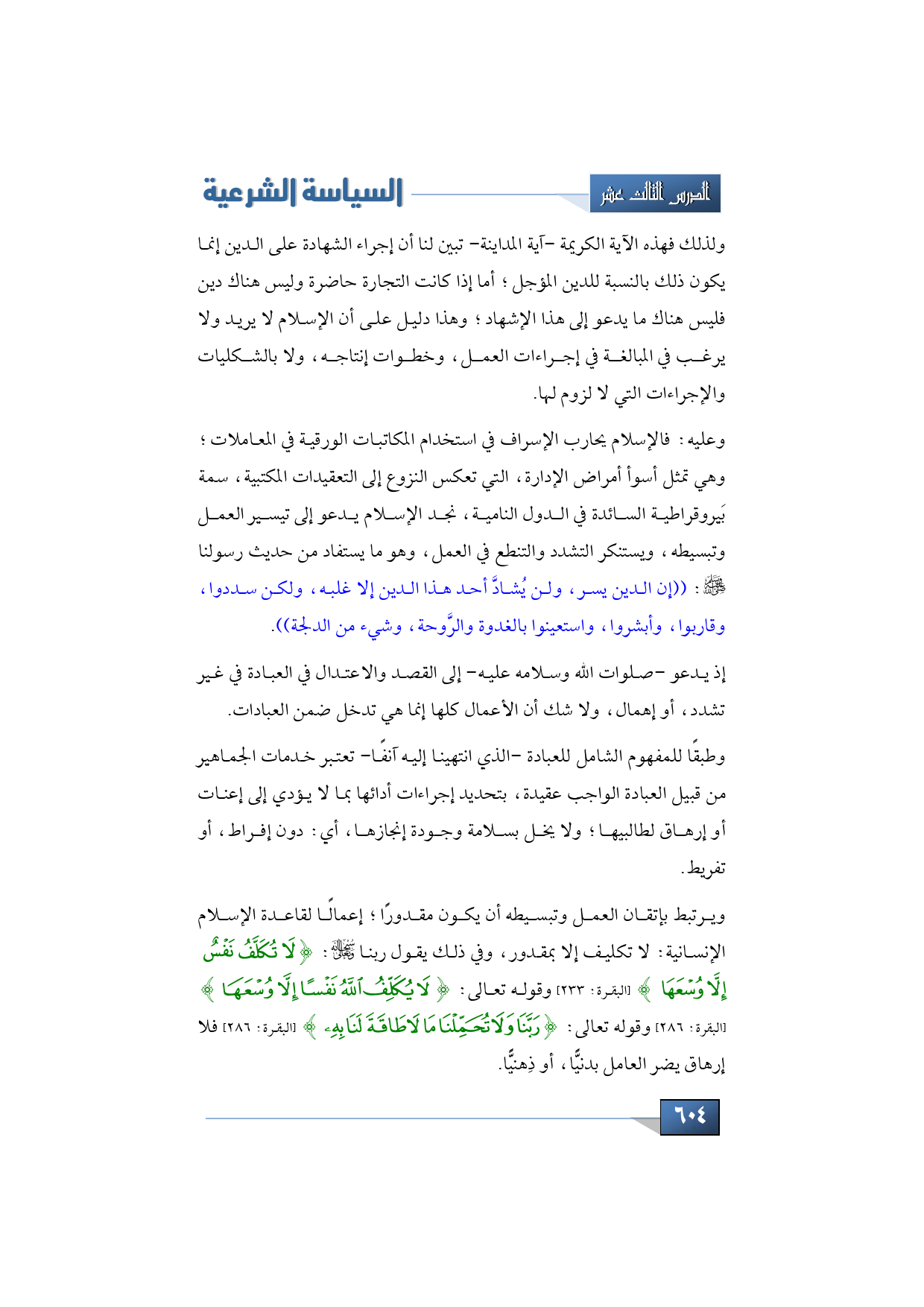 وعليه: فالإسلام يحارب الإسراف في استخدام المكاتبات الورقية في المعاملات؛ وهي تمثل أسوأ أمراض الإدارة، التي تعكس النزوع إلى التعقيدات المكتبية، سمة بَيروقراطية السائدة في الدول النامية، نجد الإسلام يدعو إلى تيسير العمل وتبسيطه، ويستنكر التشدد والتنطع في العمل، وهو ما يستفاد من حديث رسولنا -صلى الله عليه وسلم-: ((إن الدين يسر، ولن يُشادَّ أحد هذا الدين إلا غلبه، ولكن سددوا، وقاربوا، وأبشروا، واستعينوا بالغدوة والرَّوحة، وشيء من الدلجة)) إذ يدعو -صلوات الله وسلامه عليه- إلى القصد والاعتدال في العبادة في غير تشدد، أو إهمال، ولا شك أن الأعمال كلها إنما هي تدخل ضمن العبادات.