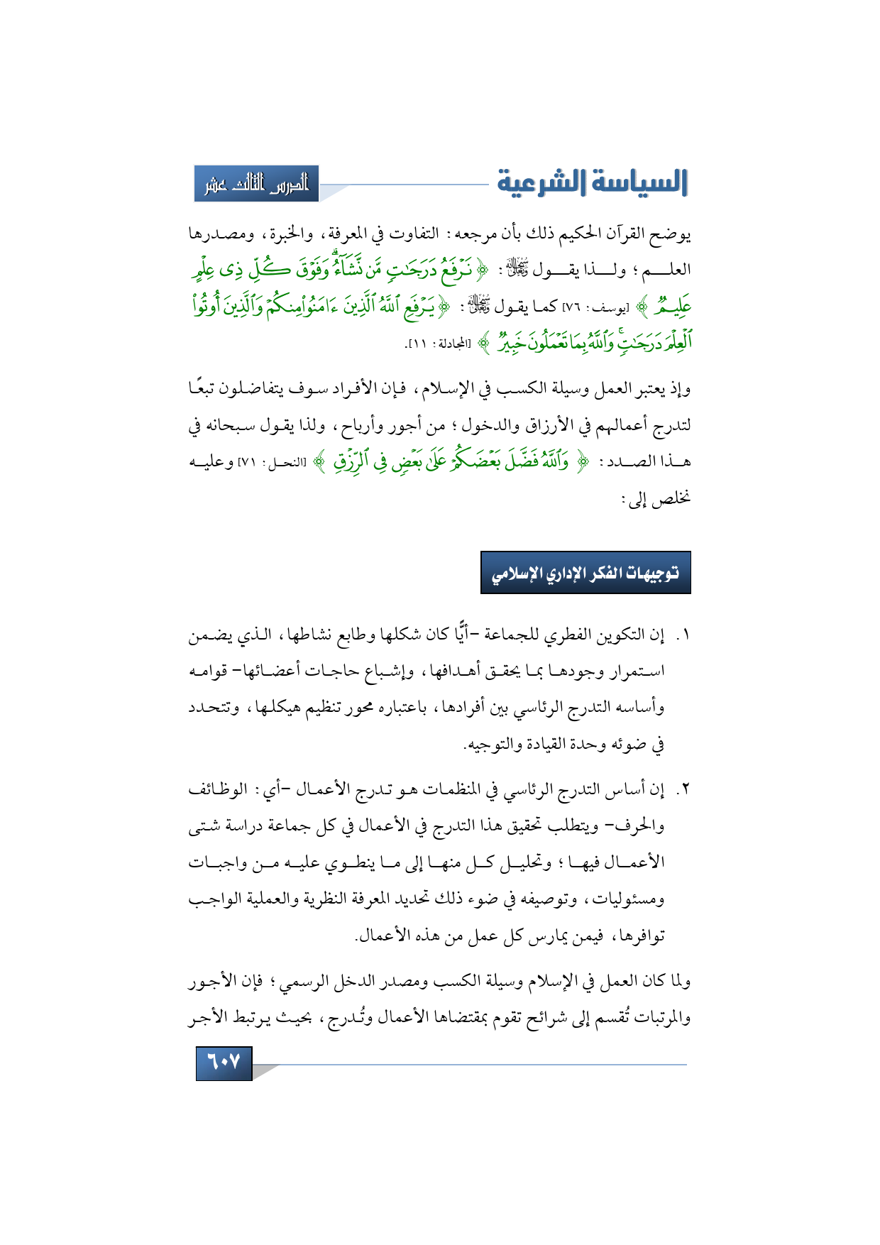 يوضح القرآن الحكيم ذلك بأن مرجعه: التفاوت في المعرفة، والخبرة، ومصدرها العلم؛ ولذا يقول -تبارك وتعالى-: {نَرْفَعُ دَرَجَاتٍ مَنْ نَشَاءُ وَفَوْقَ كُلِّ ذِي عِلْمٍ عَلِيمٌ} (يوسف: 76) كما يقول -سبحانه وتعالى-: {يَرْفَعُ اللَّهُ الَّذِينَ آمَنُوا مِنْكُمْ وَالَّذِينَ أُوتُوا الْعِلْمَ دَرَجَاتٍ وَاللَّهُ بِمَا تَعْمَلُونَ خَبِيرٌ} (المجادلة: 11) وإذ يعتبر العمل وسيلة الكسب في الإسلام، فإن الأفراد سوف يتفاضلون تبعًا لتدرج أعمالهم في الأرزاق والدخول؛ من أجور وأرباح، ولذا يقول سبحانه في هذا الصدد: {وَاللَّهُ فَضَّلَ بَعْضَكُمْ عَلَى بَعْضٍ فِي الرِّزْقِ} (النحل: من الآية: 71) وعليه نخلص إلى التوجيهات في مجال الفكر الإداري: